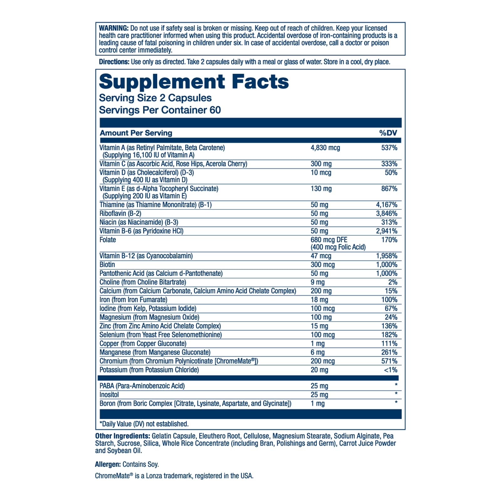 | ingredients | Vitamin A (as retinyl palmitate and 67% as natural beta carotene) 15000 IU 300% Vitamin C (as ascorbic acid, rose hips, acerola cherry) 300 mg 500% Vitamin D (as cholecalciferol) (D3) (fish) 400 IU 100% Vitamin E (as d-alpha tocopheryl succinate) 200 IU 667% Thiamine (as thiamine mononitrate) (B1) 50 mg 3,333% Riboflavin (B2) 50 mg 2,941% Niacin (as niacinamide) (B3) 50 mg 250% Vitamin B6 (as pyridoxine HCl) 50 mg 2,500% Folate (folic acid) 400 mcg 100% Vitamin B12 (as cyanocobalamin) 50 mg 500% Biotin 300 mcg 100% Pantothenic Acid (as d-calcium pantothenate) 50 mg 500% Calcium (as calcium carbonate, calcium amino acid chelate) 200 mg 20% Iron (as iron fumarate) 18 mg 100% Iodine (as kelp, potassium iodide) 225 mcg 150% Magnesium (as magnesium oxide, magnesium amino acid chelate) 100 mg 25% Zinc (as zinc amino acid chelate) 15 mg 100 * Selenium (as yeast-free selenomethionine) 100 mcg 143% Copper (as copper gluconate) 1 mg 50% Manganese 6 mg 300% Chromium (as chromium polynicotinate ChromeMate®) 200 mcg 167% Sodium 5 mg <1% Potassium (as potassium chloride) 20 mg <1% PABA (para-aminobenzoic acid) 25 mg * Choline Bitartrate 25 mg * Inositol 25 mg * Boron (as Tetra-Boron™ boron citrate, boron glycinate, boron aspartate, boron lysinate) 1 mcg * Other Ingredients: Gelatin capsule, cellulose, eleuthero root, magnesium stearate, sodium alginate, whole rice concentrate (including bran, polishings and germ) and carrot juice powder. |