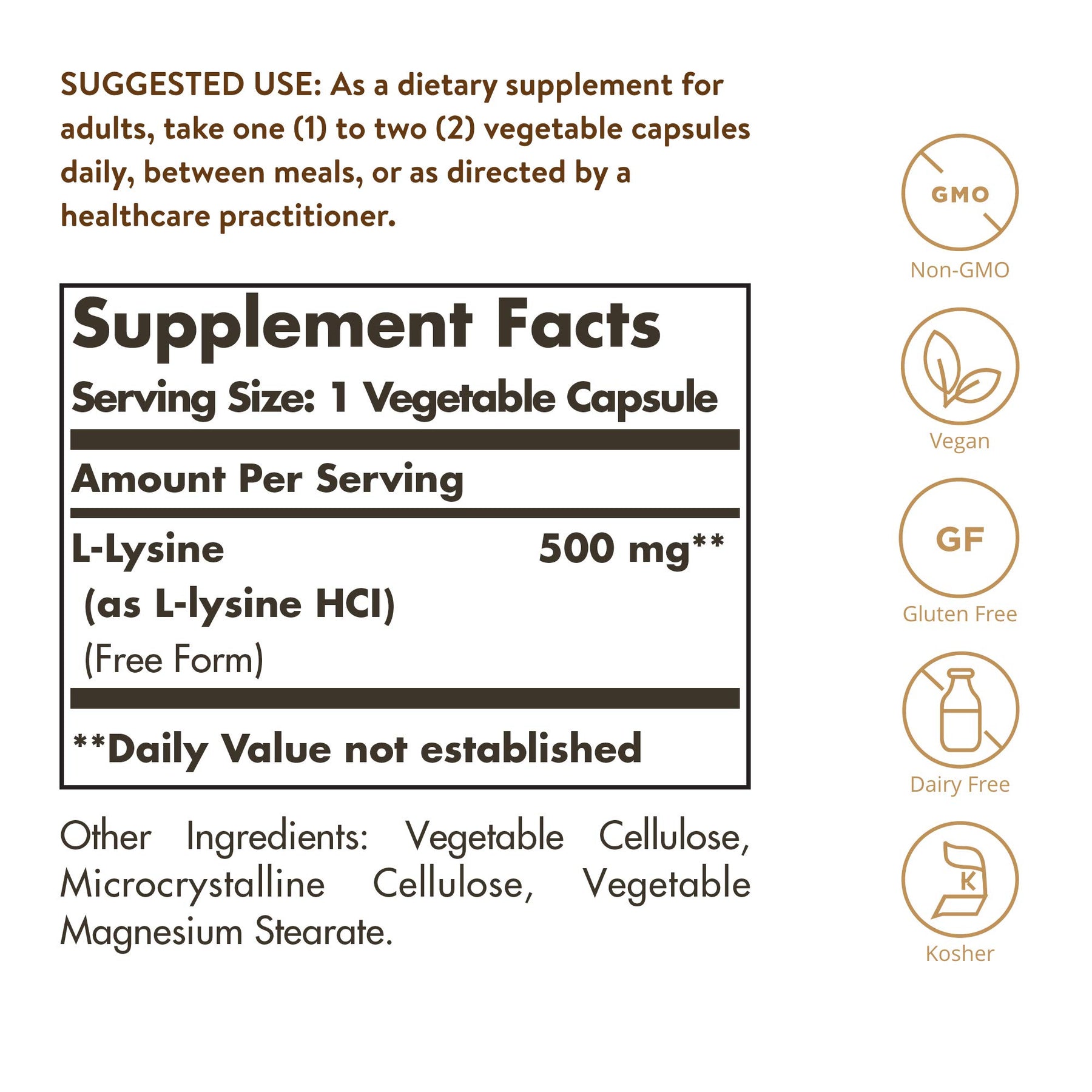 - Non-GMO & Gluten Free; Solgar L-Lysine Vegetable Capsules are suitable for vegans and vegetarians; Free of: gluten, wheat, dairy, soy, yeast, sugar, sodium, artificial flavor, sweetener, and color