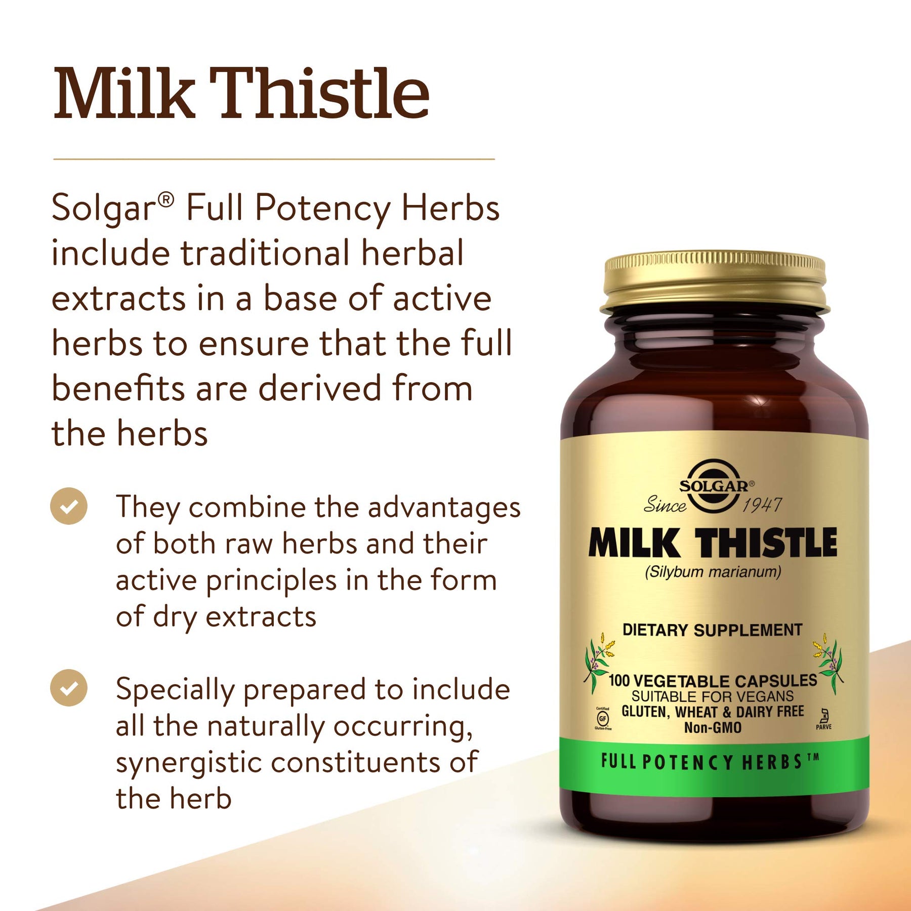 - Original Milk Thistle – Solgar Milk Thistle, 100 Vegetable Capsules - Liver Support - Full Potency (FP) - Non-GMO, Vegan, Gluten Free, Dairy Free, Kosher - 100 Servings by SOLGAR
