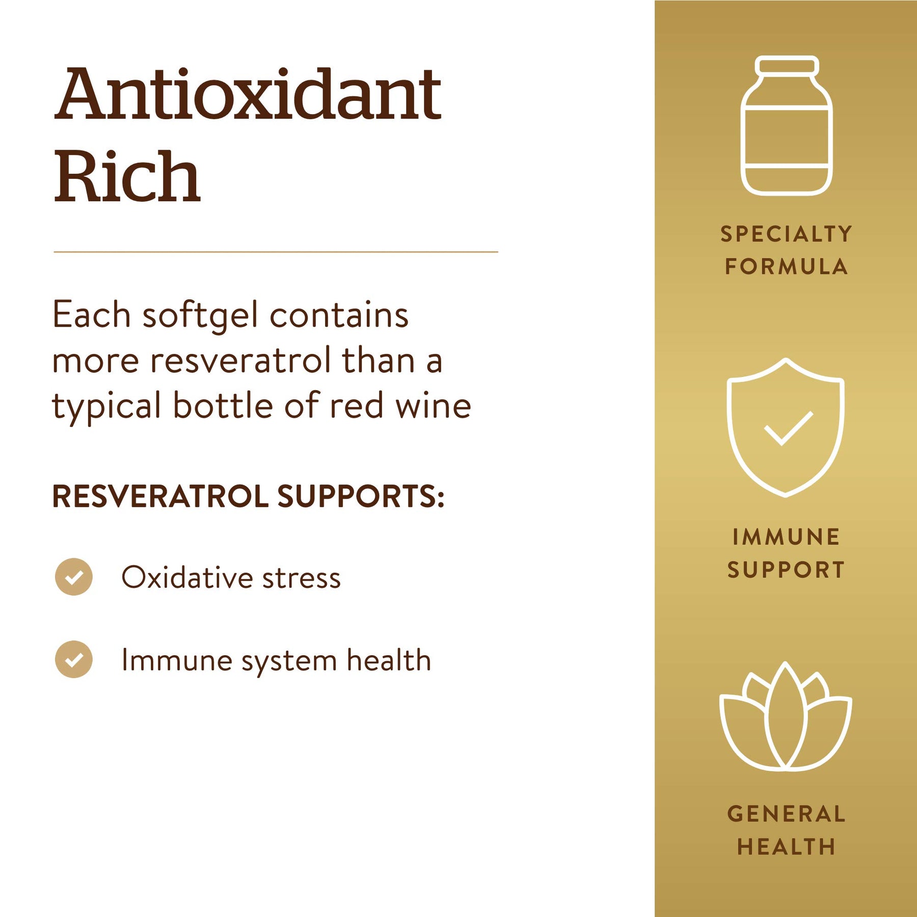 - Original Resveratrol – Solgar Resveratrol with Red Wine Extract, 250 mg, 60 Softgels - Antioxidant Protection - Immune Support - Red Wine Polyphenol - Non-GMO, Gluten Free, Dairy Free - 60 Servings by SOLGAR