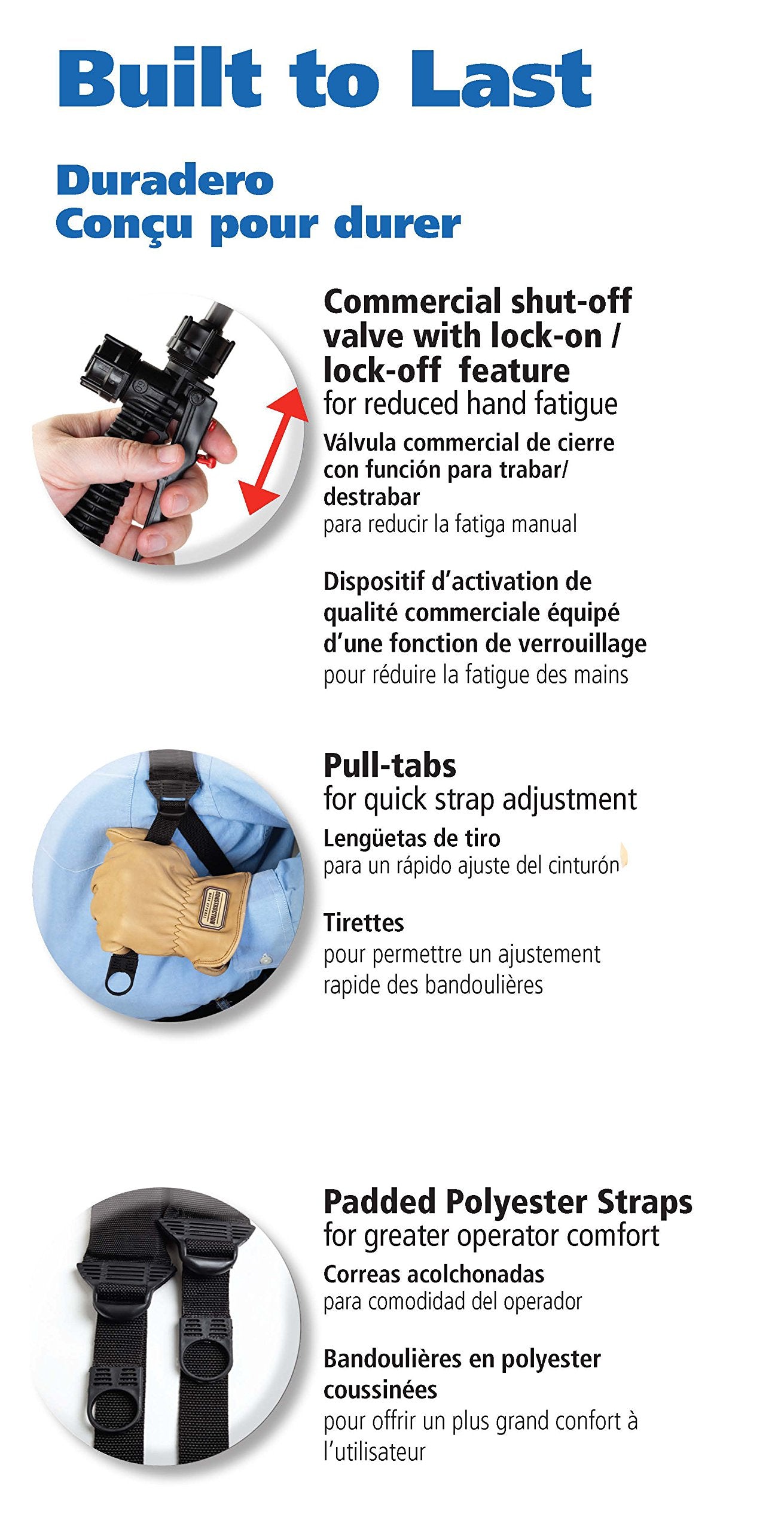 - Designed with a commercial shut-off valve that securely locks in either the on or off position to minimize user fatigue, the pump handle is interchangeable for left or right-hand operation