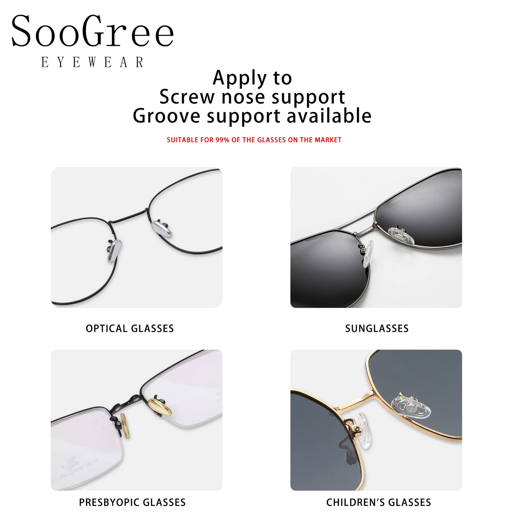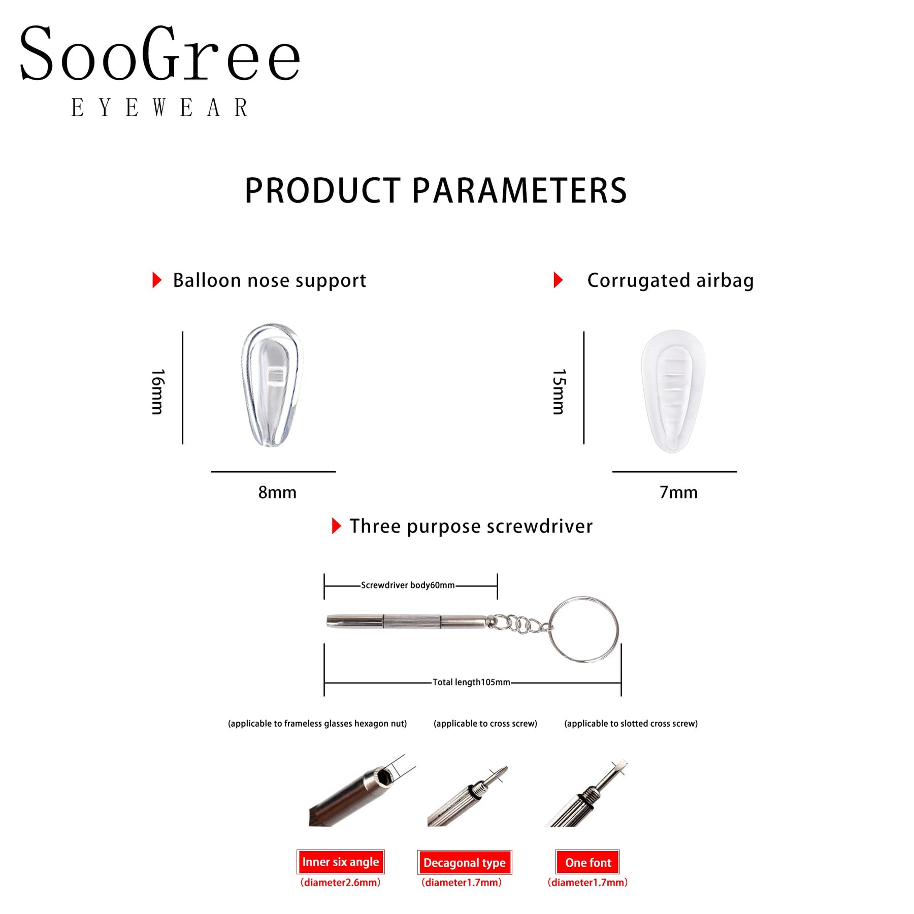 - Nose Pads SetThe set includes 20 pairs of SooGree glasses nose pads and a piece of glasses cloth, screws and screwdrivers, clips for installation. The glasses nose pads can not only increase the height and make the glasses fit you better, but also anti-slip, giving you a new glasses wearing experience.