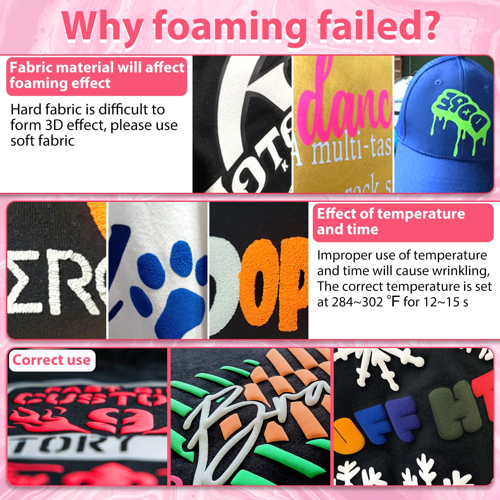 - PUFF HEAT TRANSFER VINYL: 4 sheets 12 x 10 inch 3d puff htv, this vinyl puffs up after heat press on your projects, shows a 3d stereo effect and bring you a different visual impact. When the vinyl is in plenty of light, htv can glow for a long time in the dark.