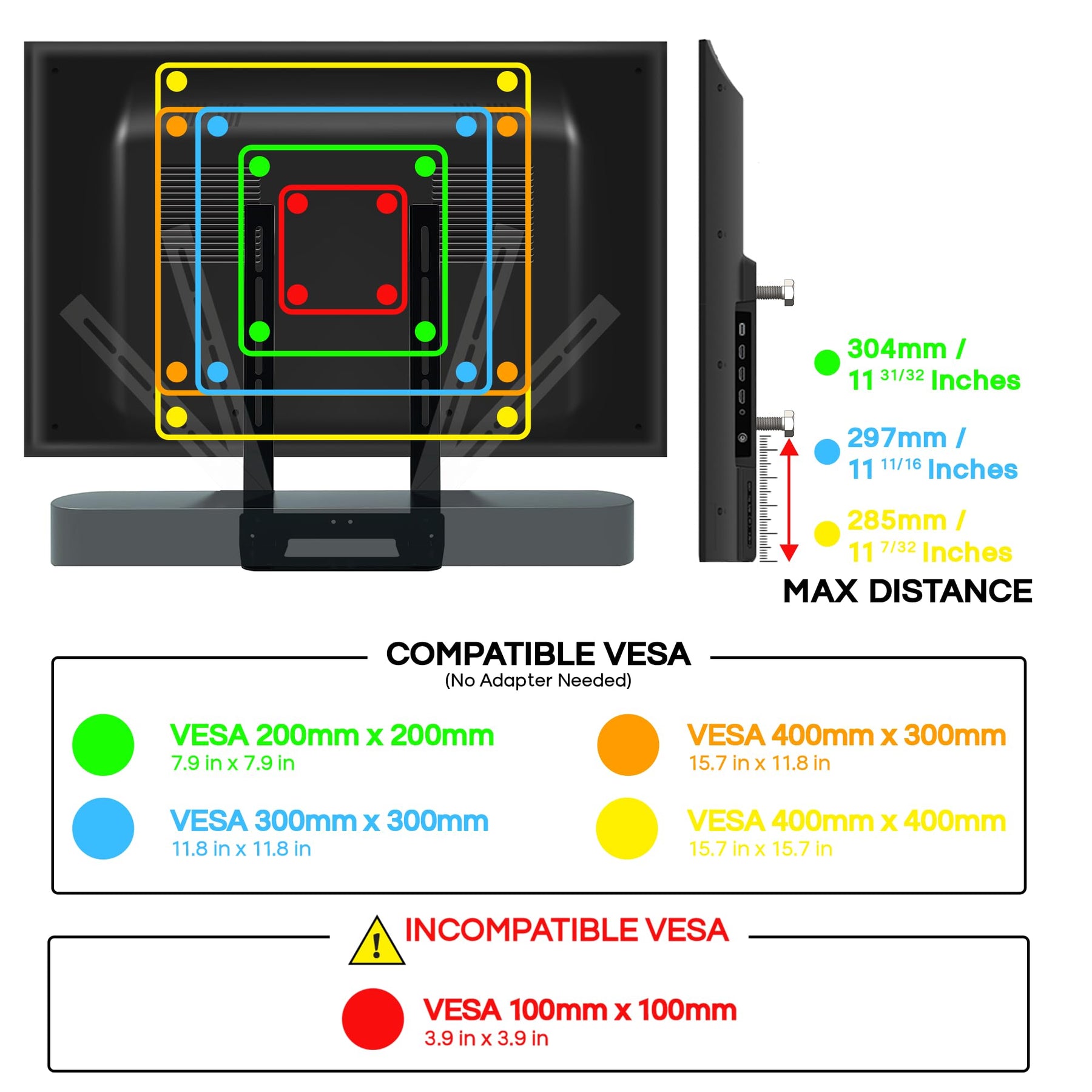 - HOW TO CHECK - Our product is an ideal match for the Sonos Beam and most TVs with a VESA pattern between 200-400mm in width, as long as the distance from the lower VESA holes to your TV's bottom edge meets these criteria: For VESA 200, it should be 304mm (11.96 inches) or less; for VESA 300, 297mm (11.69 inches) or less; and finally for VESA 400 models that must be 285mm (11.22 inches) or less.