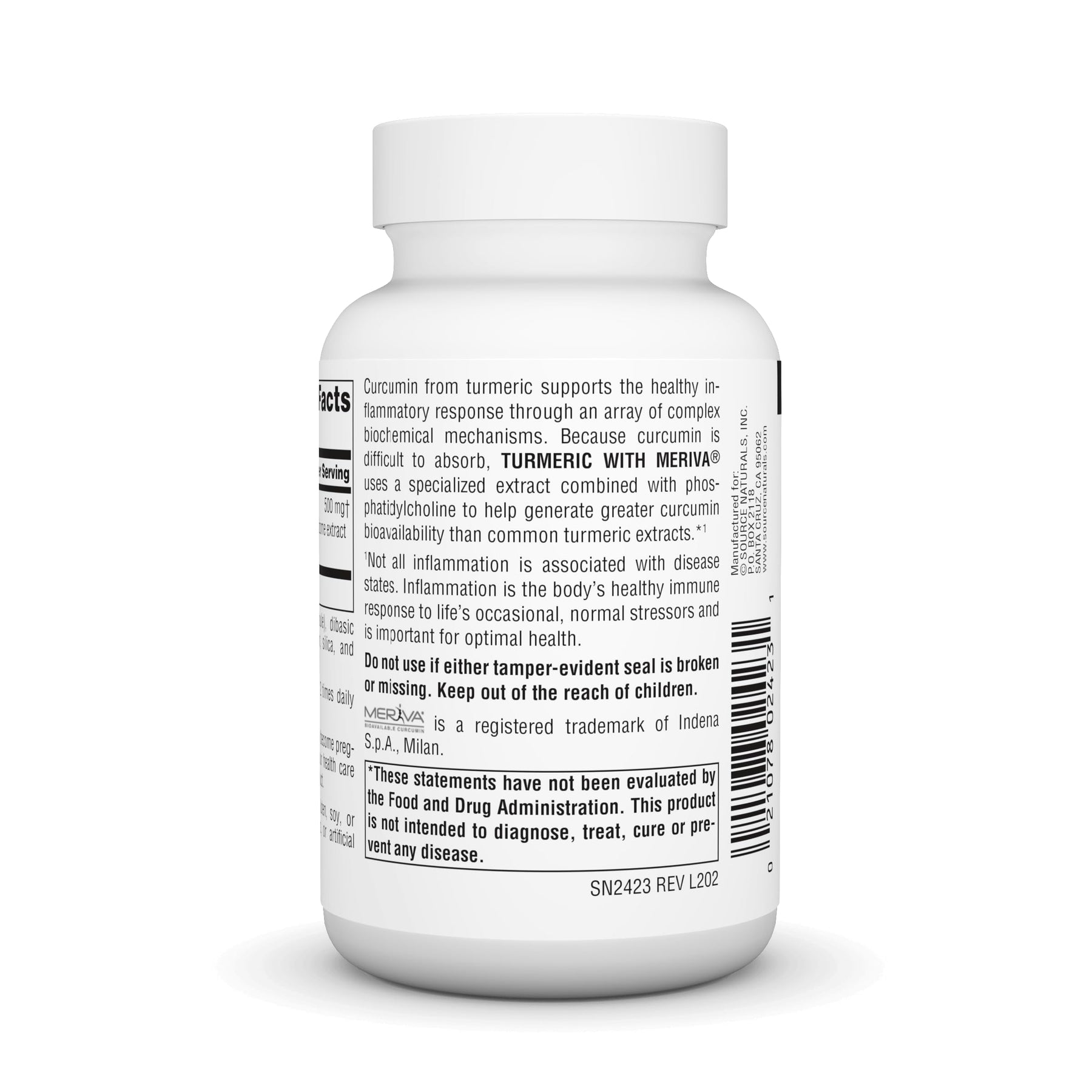 | ingredients | Meriva Turmeric Complex (proprietary blend of turmeric rhizome extract and phosphatidylcholine),Inactive Ingredients: gelatin (capsule), dibasic calcium phosphate, maltodextrin, silica, and magnesium stearate. |