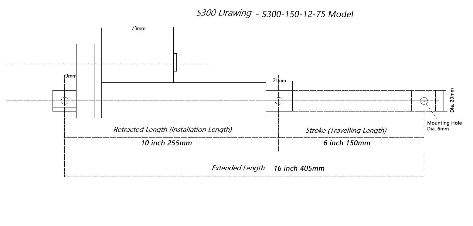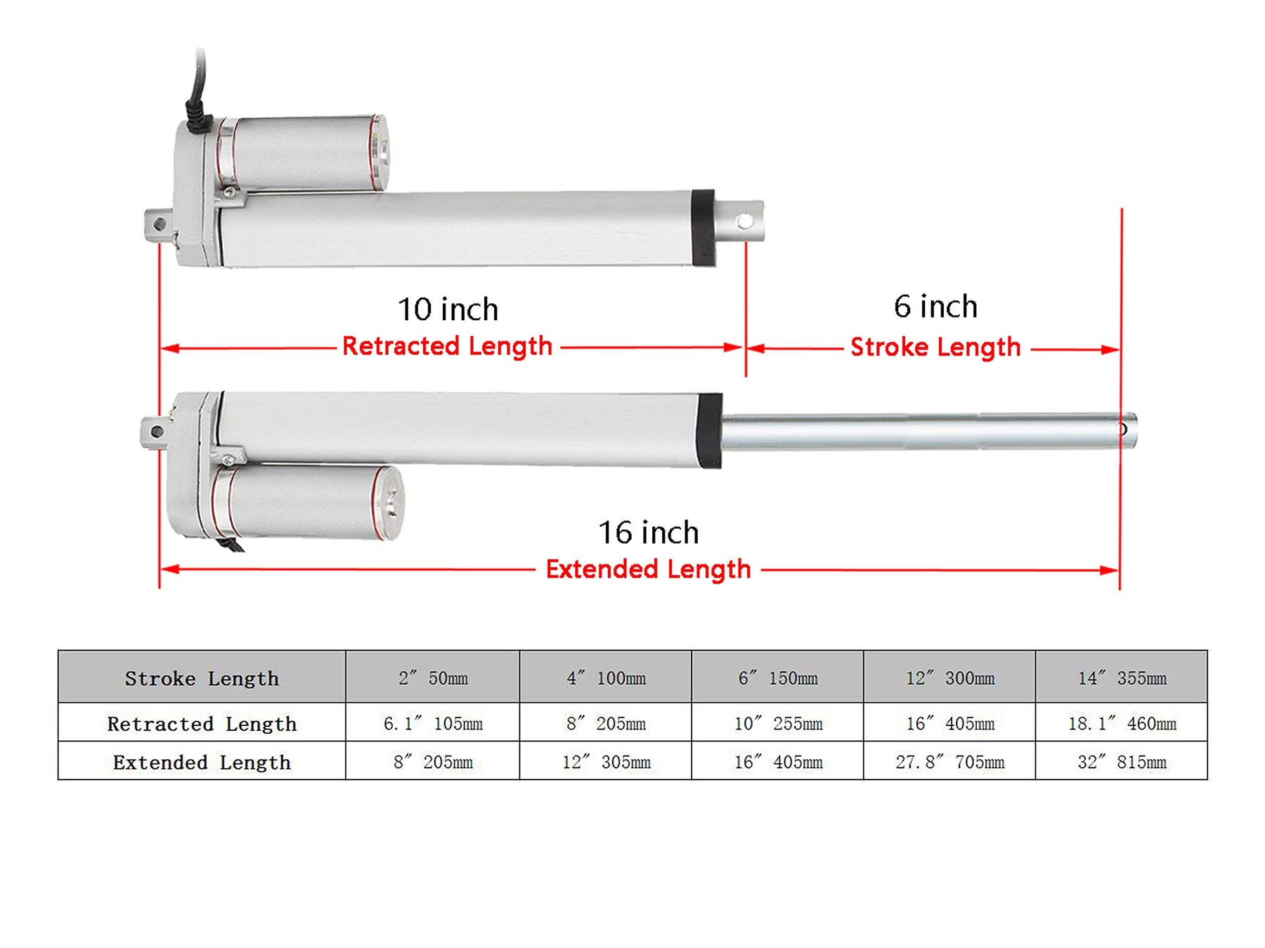 - 6 inch stroke length, 10 inch(255mm) retracted length, 16 inch(405mm) extended length