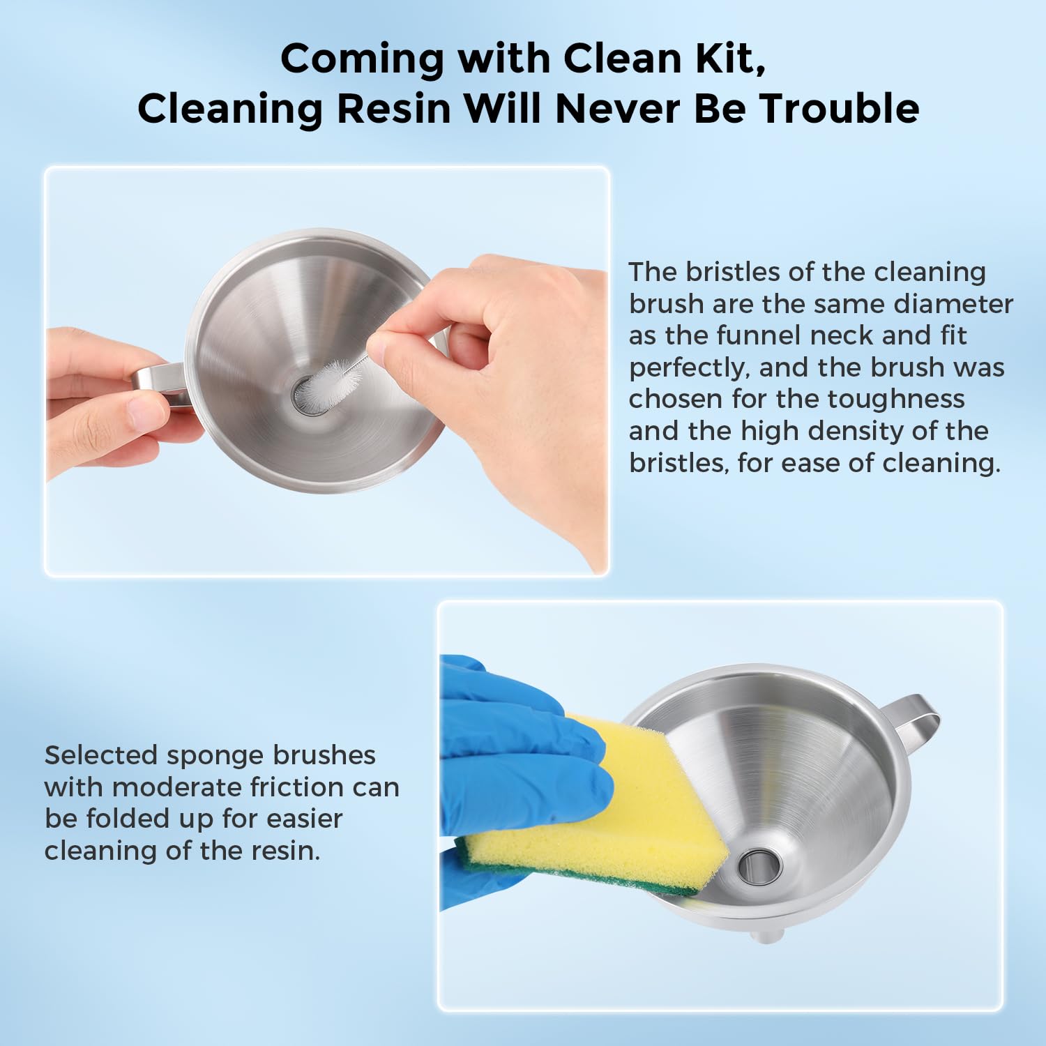 - The funnel is made of stainless steel, easy to use and clean, and effectively filters the contaminants while the resin is poured into the bottle