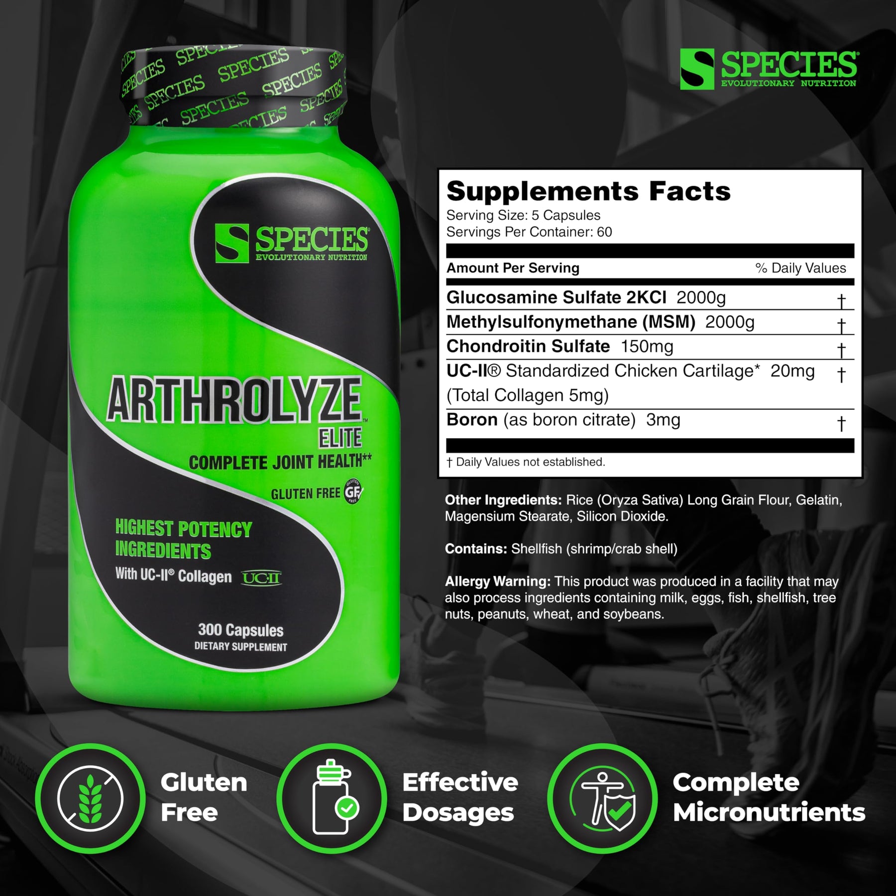 - COMPLETE JOINT AND CONNECTIVE TISSUE REPAIR: In order to properly repair joints and connective tissue damage, the body must consume the correct raw materials in the right quantities. Arthrolyze Elite from Species Nutrition contains Glucosamine Sulfate and MSM–two key ingredients that in combination allow for optimal joint and tissue repair.