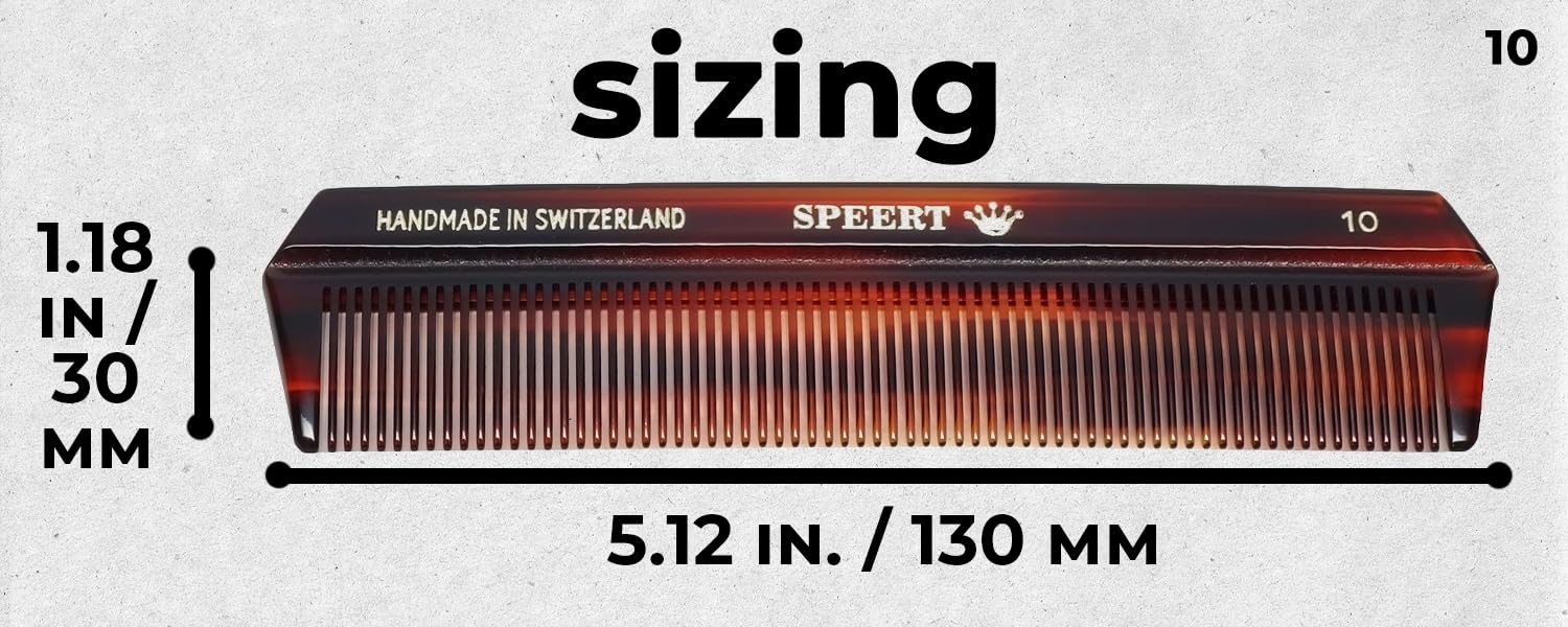 Versatile Hair Compatibility: The Speert Tortoise Comb excels in detangling, styling, and grooming needs for any hair type - curly, straight, thick, thin, short and long. Its teeth ensure a seamless glide through locks, eliminating knots and tangles, promoting a healthier, smoother hair texture without causing damage. This comb merges functionality with the needs of diverse hair types, providing a universally beneficial grooming tool. Measures: 5.12 x 1.18 x 0.12 (130 x 30 x 3 MM);Sophisticated Design: Featuring a distinct burgundy brown tortoise havana pattern, the Speert Tortoise Comb brings a touch of elegance and sophistication to your grooming routine. This stylish accessory not only serves its practical purpose but also enhances the aesthetic appeal of any grooming station. It's designed for those who seek to elevate their daily hair care regimen into a refined, luxurious experience, making it an essential element of personal care for discerning individuals.;Handmade Switzerland Craftsmanship: The Speert Tortoise Comb is a product of Swiss precision and dedication to craftsmanship. Handmade in Switzerland, each comb is a reflection of a commitment to durability, embodying the meticulous attention to detail that Swiss products are renowned for. This commitment ensures a grooming tool that not only meets the functional needs of hair care but also stands as a durable, long-lasting accessory in your collection.;Durable Acetate Material: Constructed from robust cellulose acetate, the Speert Tortoise Comb is built to endure the rigors of daily use while maintaining its sophisticated appearance. This material choice underscores the comb's blend of practical durability with an elegant design, ensuring that it remains a central piece of your grooming arsenal for years to come. The cellulose acetate material also contributes to the comb's smooth glide through hair, enhancing the overall grooming experience.;Timeless Tradition: Rooted in a tradition that stretches back to 1792, the Speert Tortoise Comb is more than just a hair accessory; it's a piece of hair care heritage. This comb not only embodies the legacy of grooming excellence but also integrates it with contemporary functionality, providing a grooming experience that is unmatched. Its historical significance and modern application make it a unique tool for anyone looking to incorporate a piece of grooming history into their routine.