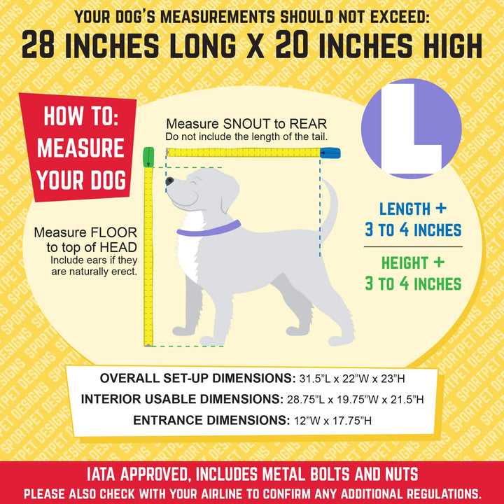 - Your dog’s measurements should be under 29” L x 20” H for large kennel