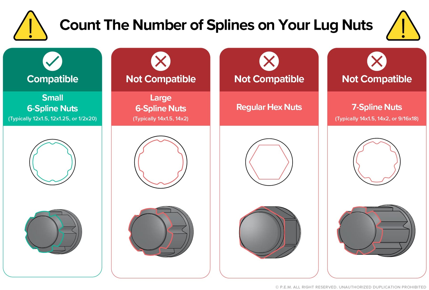 - NOT compatible with larger spline lug nuts (M14 or 9/16) such as ones for Truck/SUV. Also NOT compatible with spike lugnuts.