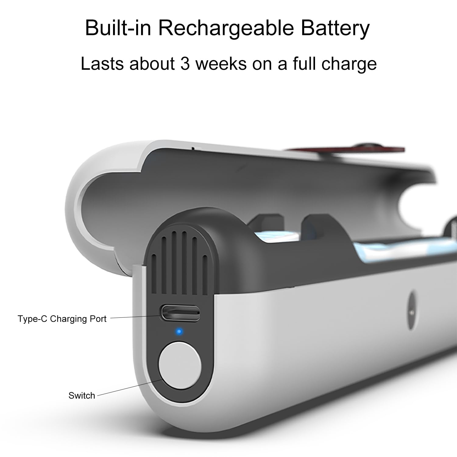 - Built-in Rechargeable Battery: The UV toothbrush case has a battery that does not require you to purchase batteries. Using the USB-C charging port, it can be fully charged in about 3 hours and a full charge lasts about 3 weeks