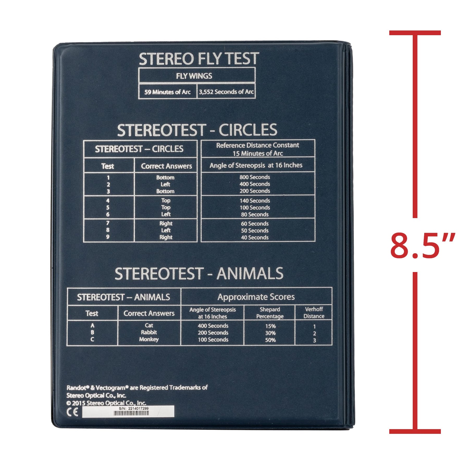 The Stereo Fly Tests provide an easily administered check of stereoscopic depth perception at any age level. Its purpose is to measure how minutely the two eyes can discern differences in the distances of objects from the observer. Other depth determinants such as size, overlapping, perspective, etc. must be excluded to demonstrate the integrity of the fusion mechanism. Stereo Optical’s Vectogram is an ideal medium for this test. Without introducing instruments or lenses or prisms, the images for the right eye and left eye may be superposed, and stereoscopic disparities introduced in graded steps.