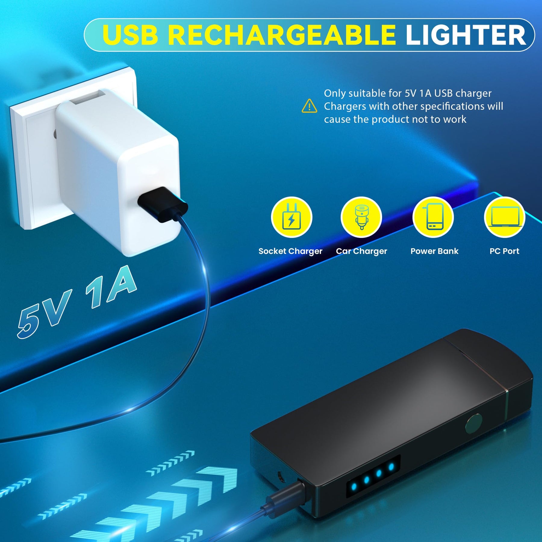 - : USB rechargeable lighter features an upgraded lithium battery that is more lasting and can be fully charged in about 1.5 hours, equivalent to 300 traditional lighters. The body has 4 LED indicator lights to display real-time battery level and remind you of remaining power. It does not require gas or butane, making it safe, environmentally friendly, and cost-effective