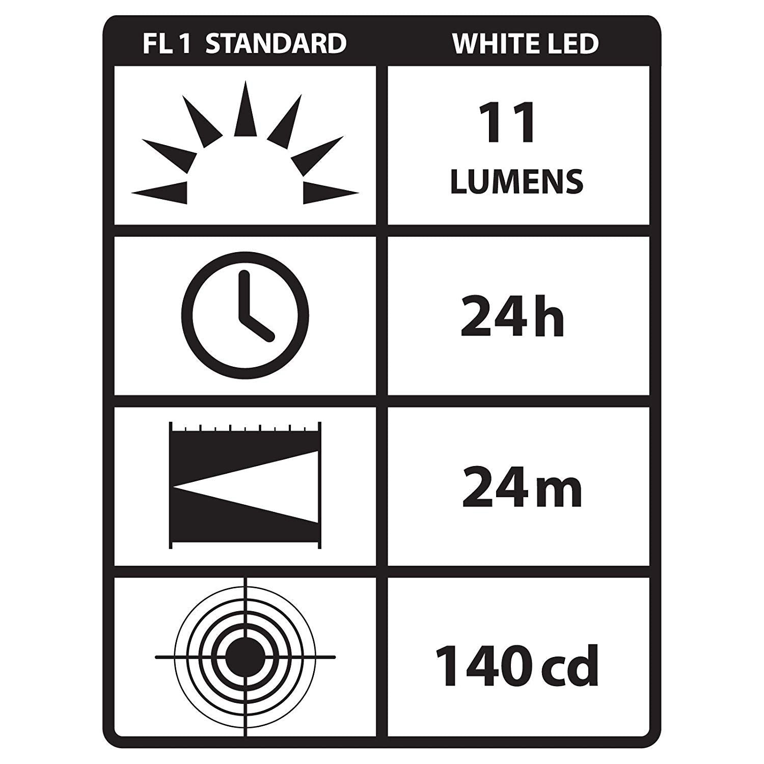 - 11 lumens; 140 candela; 24 meter beam distance; 24 hour runtime