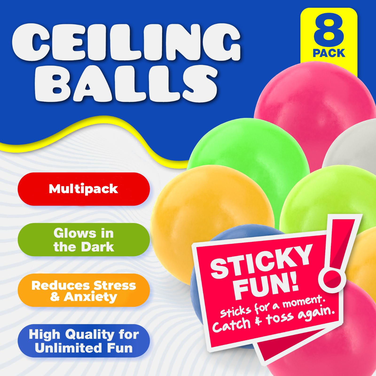- FUN GLOW-IN-THE-DARK COLORS - Enjoy these large sticky balls for ceiling in 8 awesome glow in the dark colors. Material is pliable, durable, stretchable, and tear-resistant with no odor. The sticky glow balls make perfect gifts, stocking stuffers, care package items, and party favors.