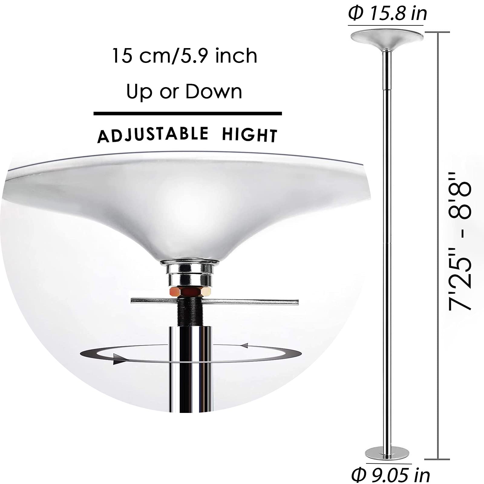 - Adjustable Height - Height from 4.2´ to 8.8´. Our stripper pole has 8 combinations that will fit 90% ceiling height. After install all pole, you can twist the pole to against ceiling.
