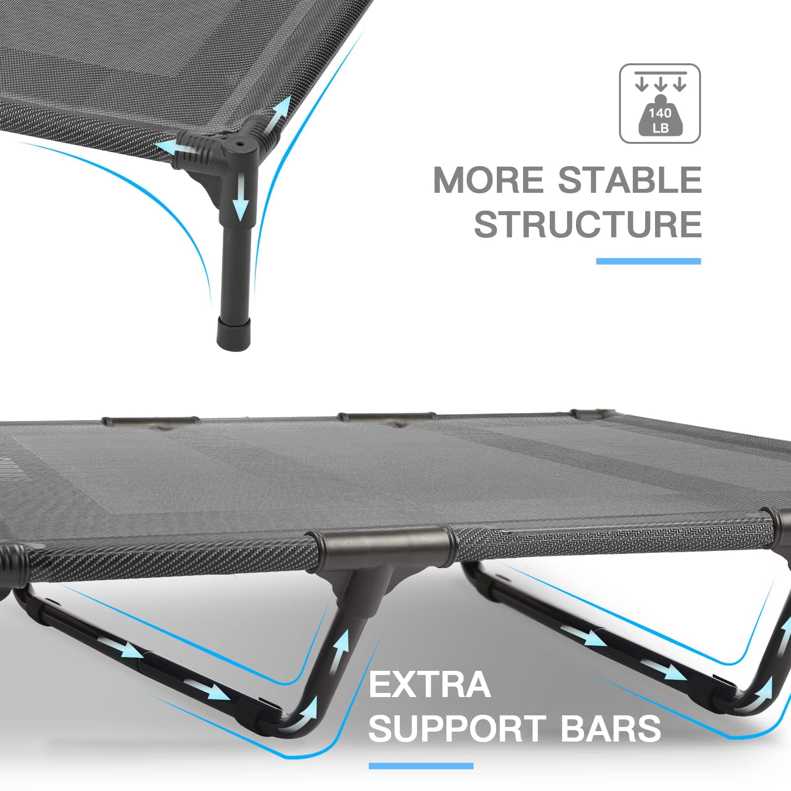- [Durable Dog Cot] Dual steel support bars and 4 non-slip rubber feet keep it stable and increase load capacity. The 0.8mm thick steel pipe bars are hard to break. Holds 140lbs – stable even for Great Danes jumping on/off. This outdoor dog bed evenly distributes weight and offers hammock-like comfort.