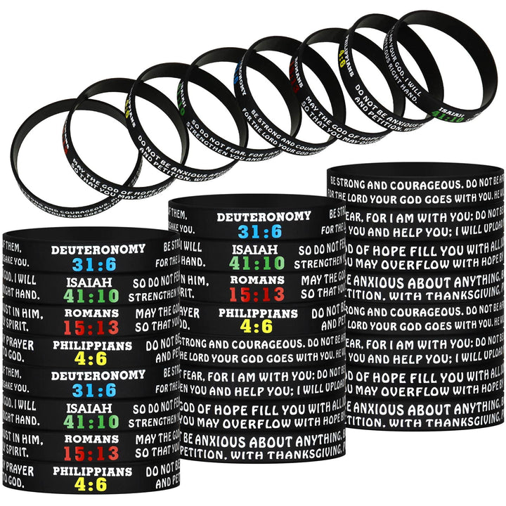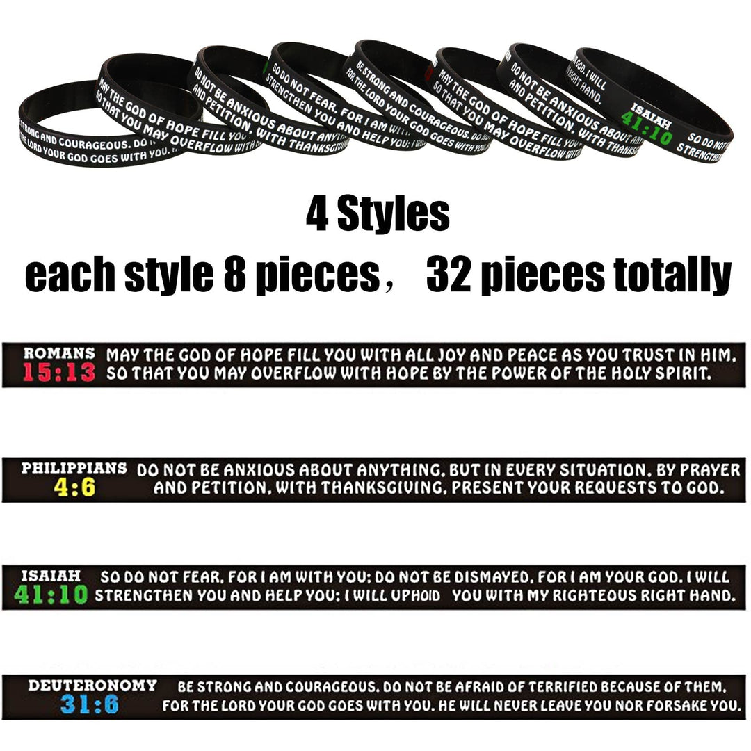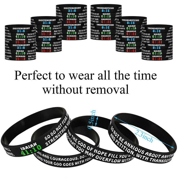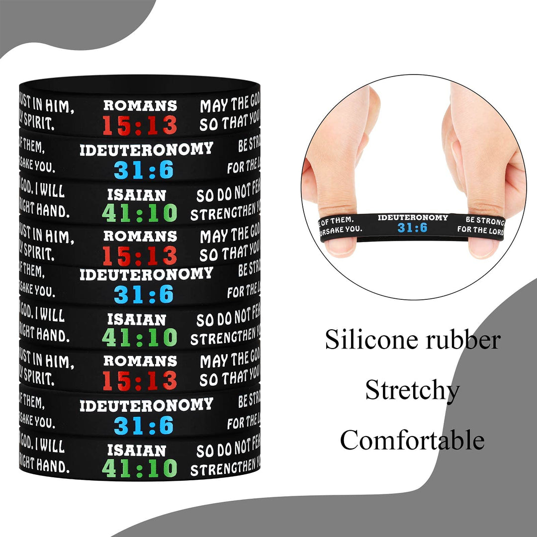 - Rubber bracelet with Bible verses: these rubber bracelets are designed with inspirational messages, including 4 essential scriptures, such as ROMANS 15:13, PHILIPPIANS 4:6, ISAIAN 41:10, DEUTERONOMY 31:6, bright and cheerful bracelets can help stimulate, motivate and keep you positive whole day
