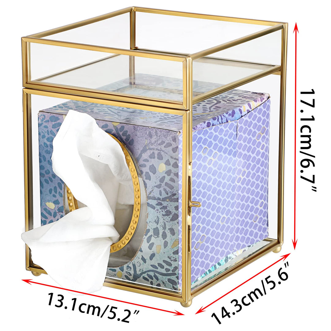 - Clear Glass & Beautiful Gold Metal - This tissue box cover is made of sleek glass and premium metal. The metal frame is carefully finished with beautiful gold color, clear glass design allows you to see all sides of your tissue.