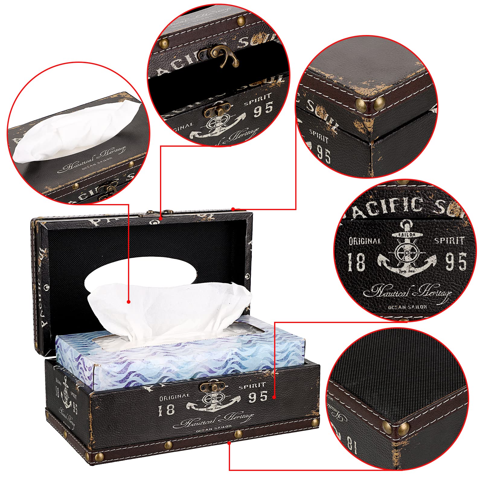 - High Quality - The tissue box cover is made of high quality wood(inside) + faux Leather (outside) materials with attractive retro pattarn, and the stitches are absolutely tidy & gorgeous.