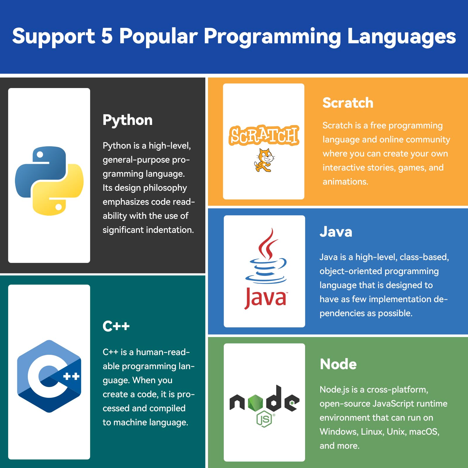 - Supports Multiple Languages: The Raspberry Pi 4 Kit offers versatility with support for 5 programming languages - Python, C, Java, Node.js and Scratch, providing a diverse programming learning experience
