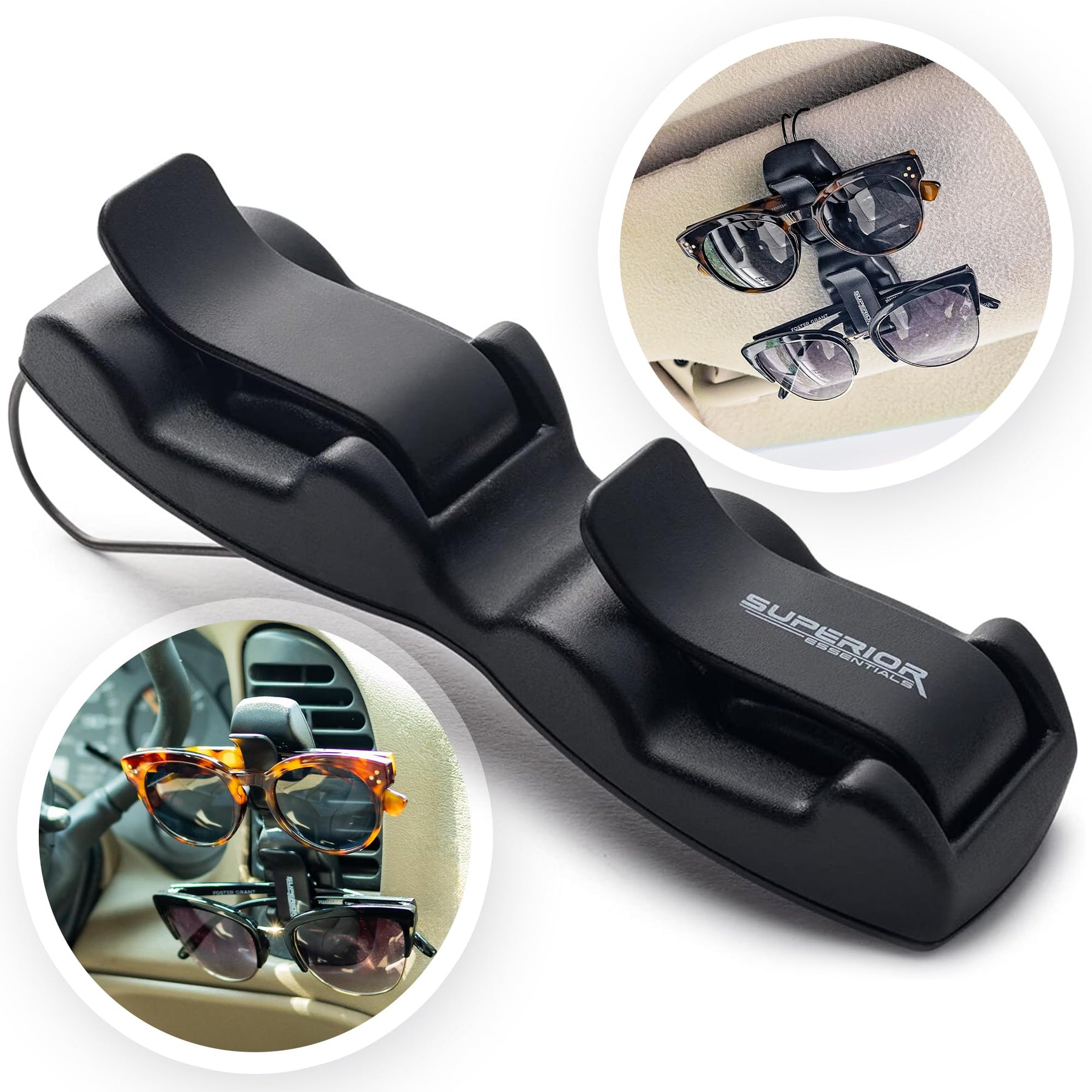 - : Embrace the fusion of style and function with our patented Superior Essentials Car Glasses Holder. Impeccably crafted from premium, durable plastic, our visor sunglasses holder clip features a waterproof, scratch-resistant, and non-slip surface. offering a visually appealing and functional home for your eyewear. With our visually appealing eyeglass holder, experience the luxury of always having your sunglasses within reach, without them interfering with your road view