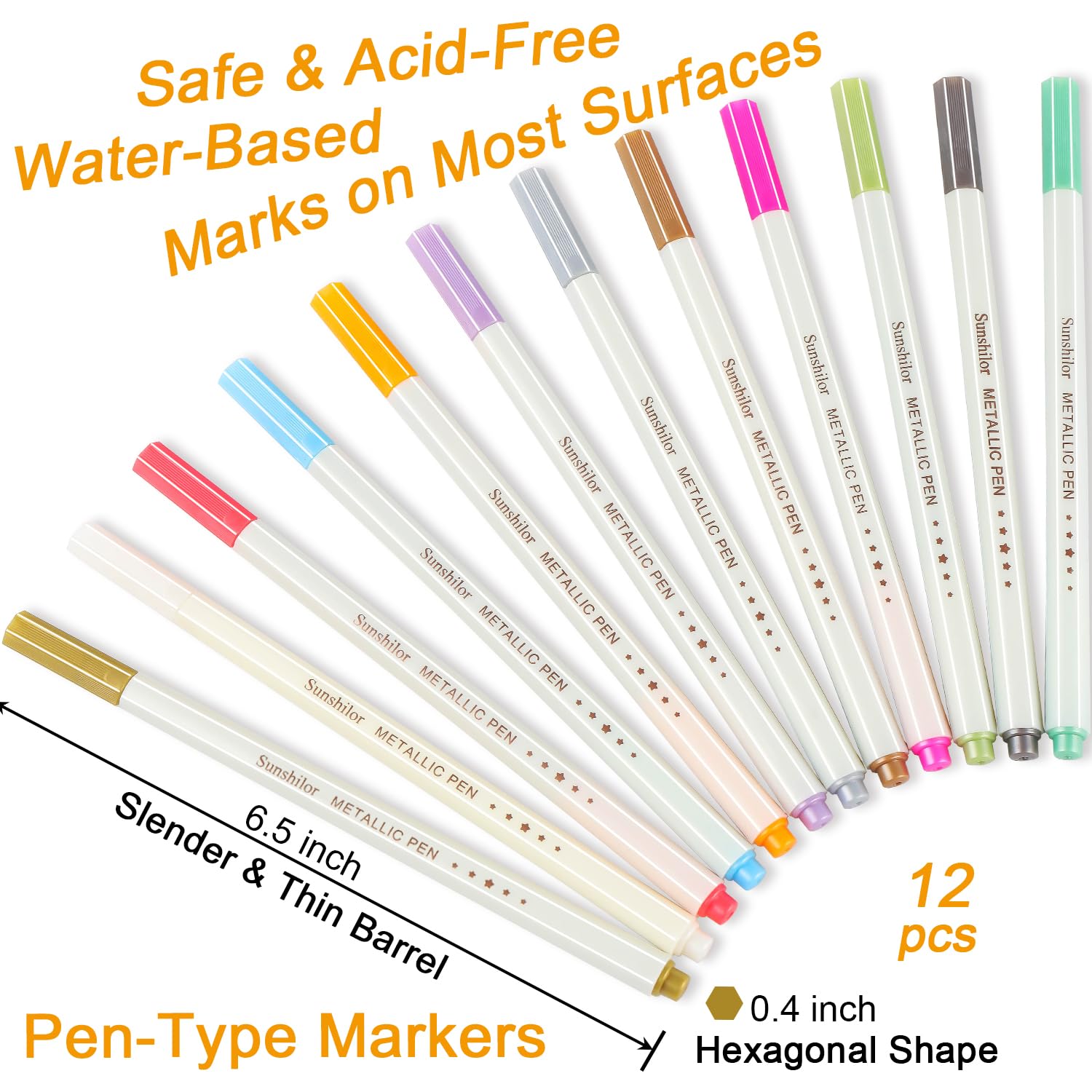 - Safe & Acid-Free - Metallic artist markers are made with water-based, opaque metallic ink. The ink is acid-free and non-toxic. Ergonomically designed, ensuring comfort even when you work with metallic color pens for a long time. You need not shake them up like most paint pens. Safe and acid-free metallic markers for kids and adults