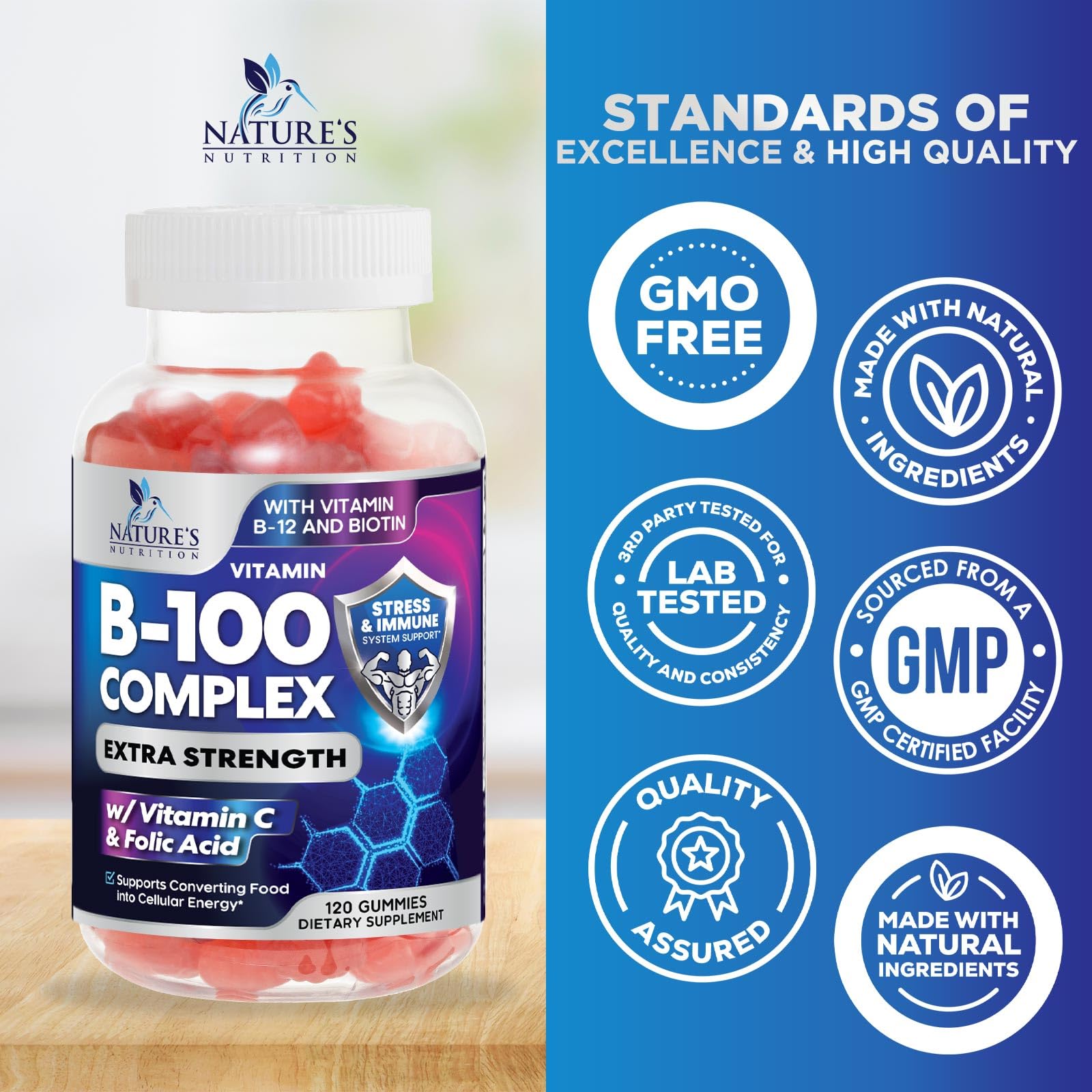 - Original B-Complex – B Complex Gummy with Vitamin C & Folic Acid, Extra Strength Vitamin B Gummies Supplement with Niacin, B6, Folic Acid, Super B12, Biotin, Nature's Energy Immune Support Supplements - 120 Gummies by Nature's Nutrition