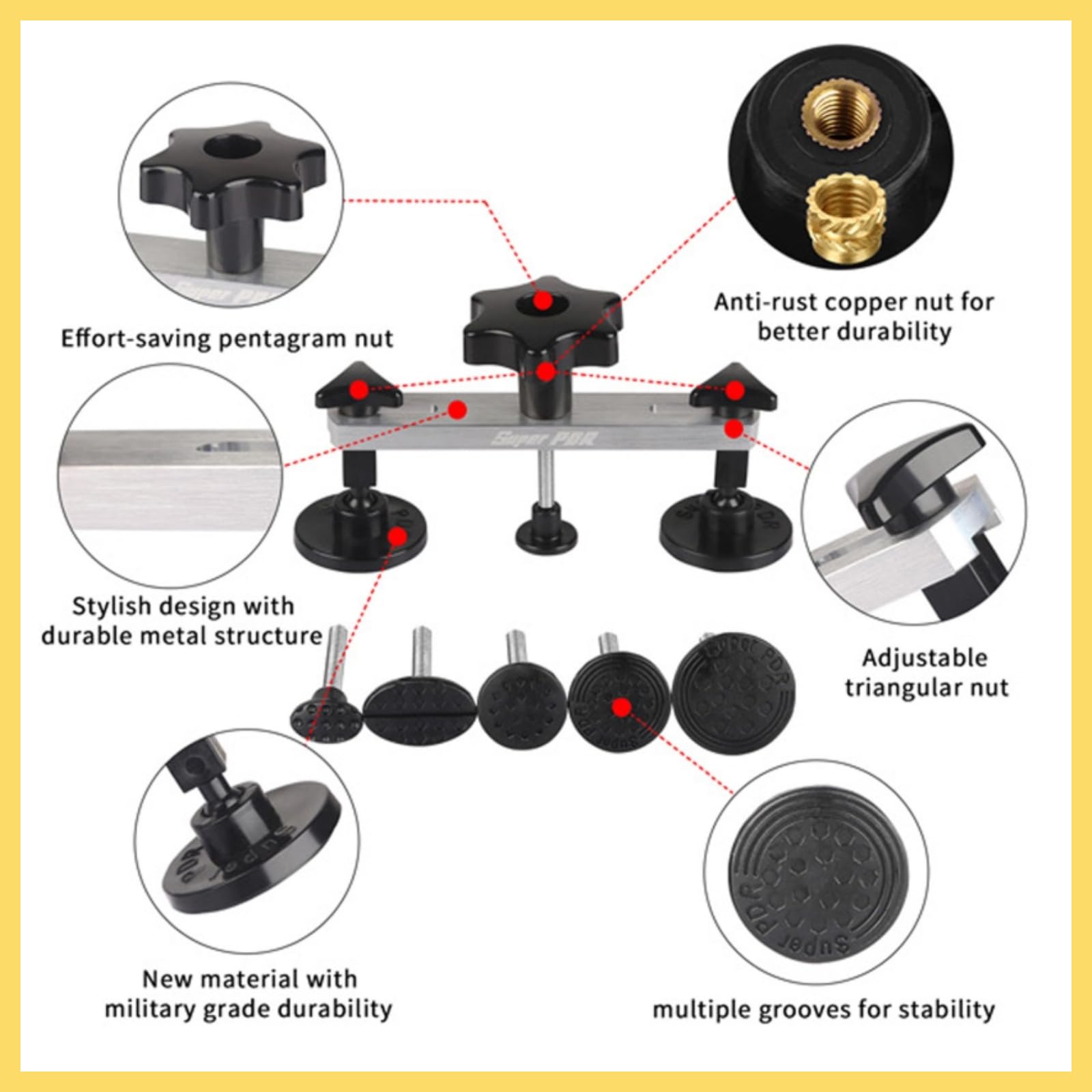 - **Versatile Dent Removal Kit** : Experience professional dent repair at home with our Super PDR Car Dent Puller. This all-in-one paintless dent removal kit, tailored for car owners, includes a versatile set of tools like dent lifter, bridge puller, and T-bar puller, effortlessly adapting to dents of all shapes and sizes. No matter the dent, our kit provides the solution you need.