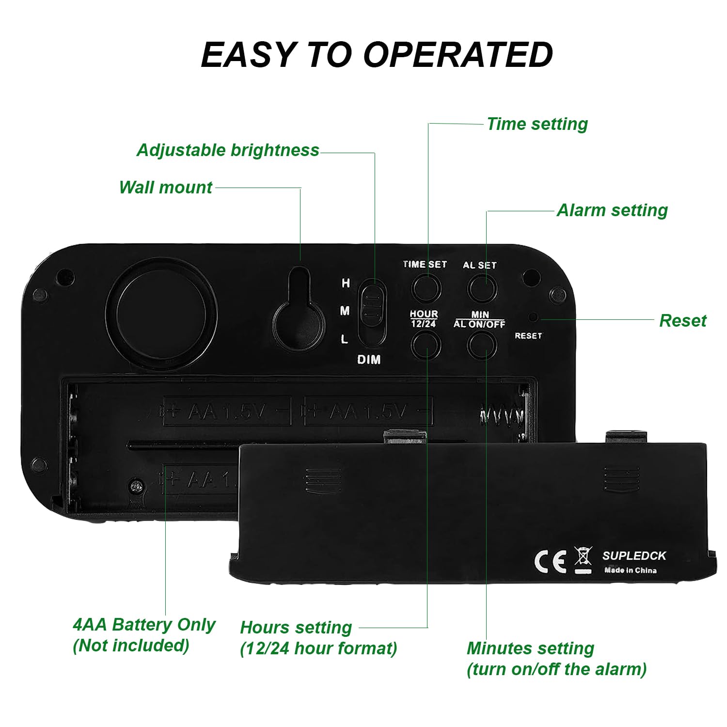 - Bright True LED Time DisplayThe digital clock 24hour light up 1.2 large led time numbers can let you check your time clearly from a distance or even in the dark and without any operations. (Note: SUPLEDCK LED clock is operated by batteries only, it can't be placed in a very bright place, or the display will be fuzzy then the numbers are difficult to read.)