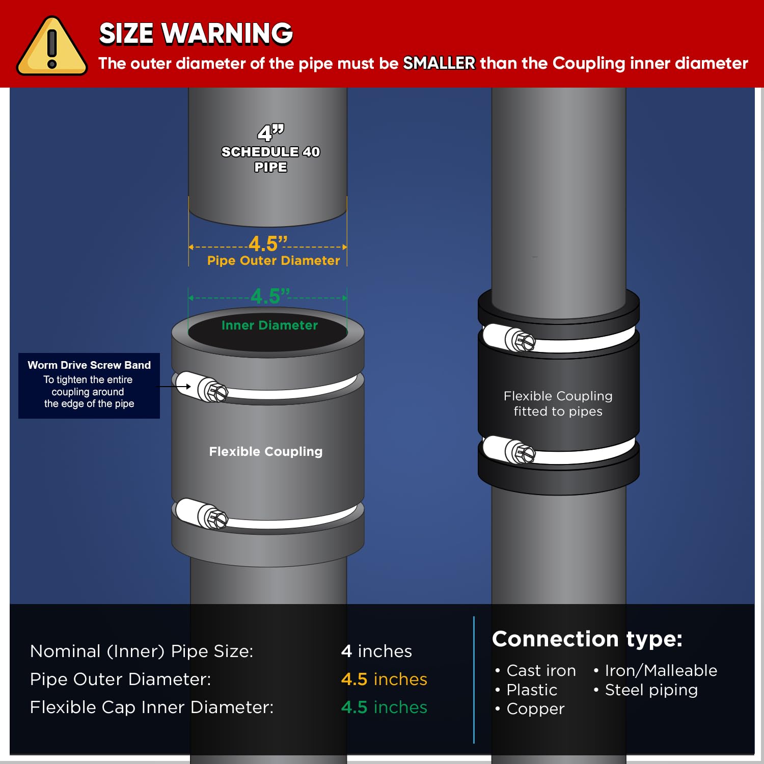- ATTENTION: Please verify that the outside diameter of the Schedule 40 pipe is small enough to fit correctly within the inside diameter of the Flexible Coupling measuring 4.5 inches