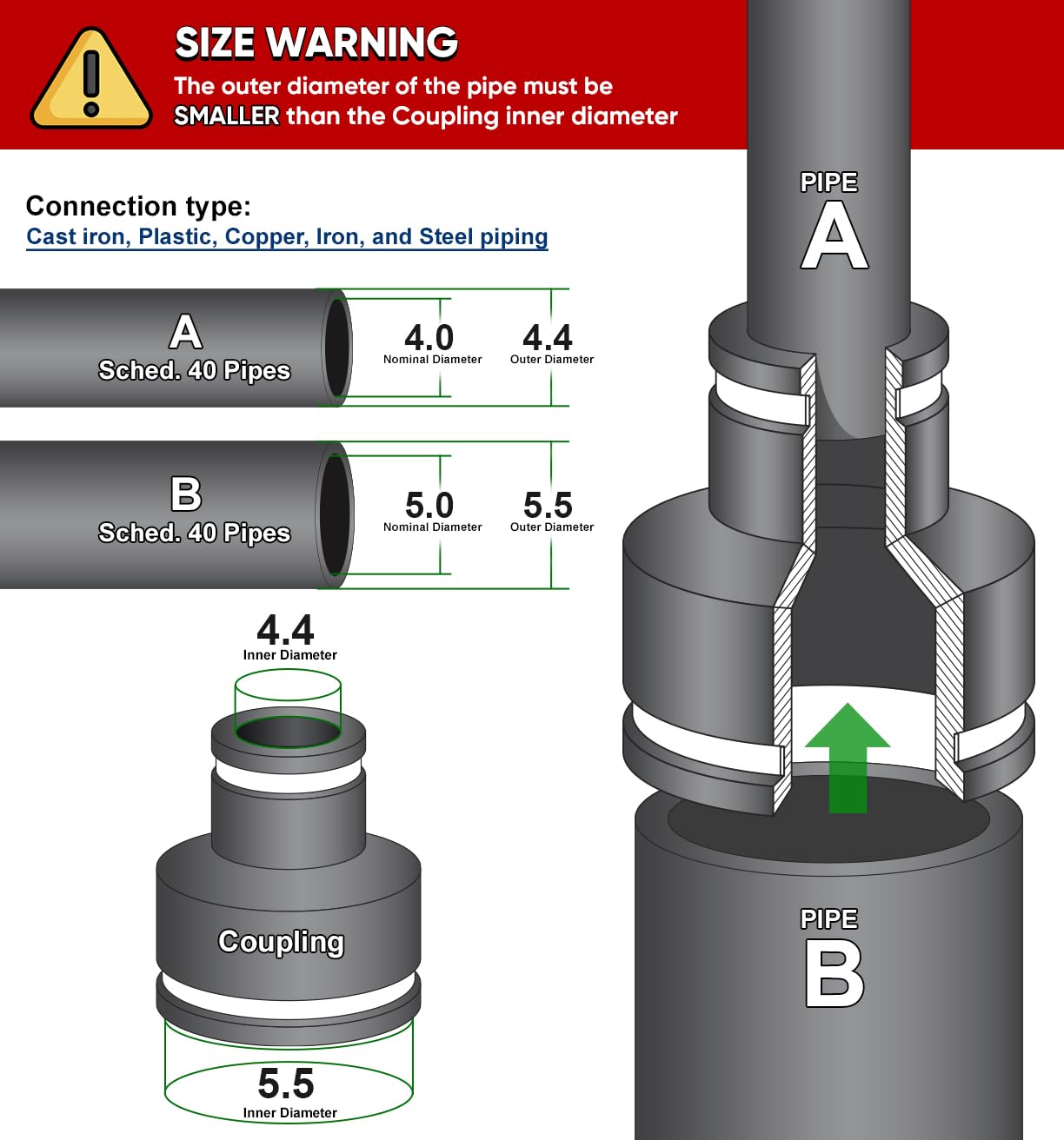 - Flexible Coupling Compatible with cast Iron, plastic, copper, lead, and steel piping