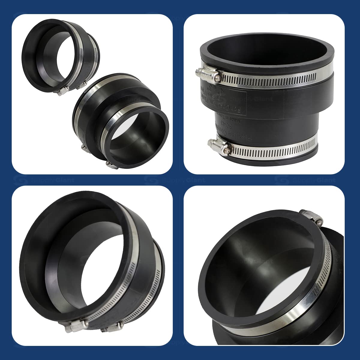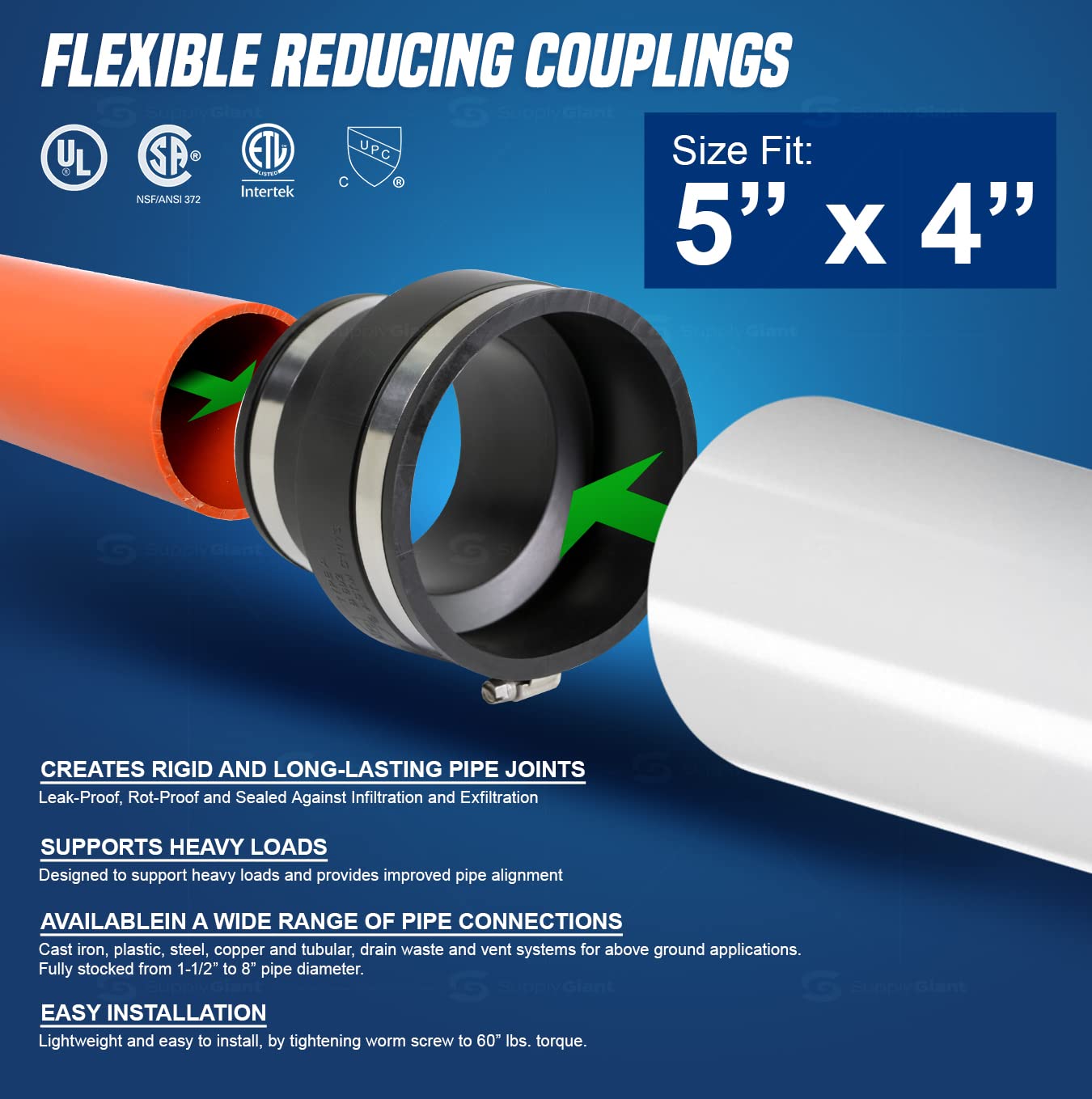 - Original Pipe Fittings – 6I59 Flexible Pvc Reducing Coupling with Stainless Steel Clamps, 5.5 x 4.5Inner Diameter for 5 x 4 Nominal Pipe, Black by Supply Giant