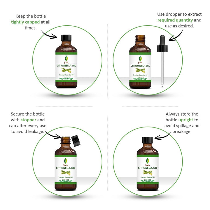 - Skin Care: SVA Citronella Oil is very useful for application on the skin. Always dilute with suitable carrier oil before use since the oil is highly concentrated. For application on the skin, simply mix a few drops of the essential oil with carrier oil and massage on the body. You may also use it by mixing a few drops of the oil with cosmetics like face creams, body lotions, and bath products