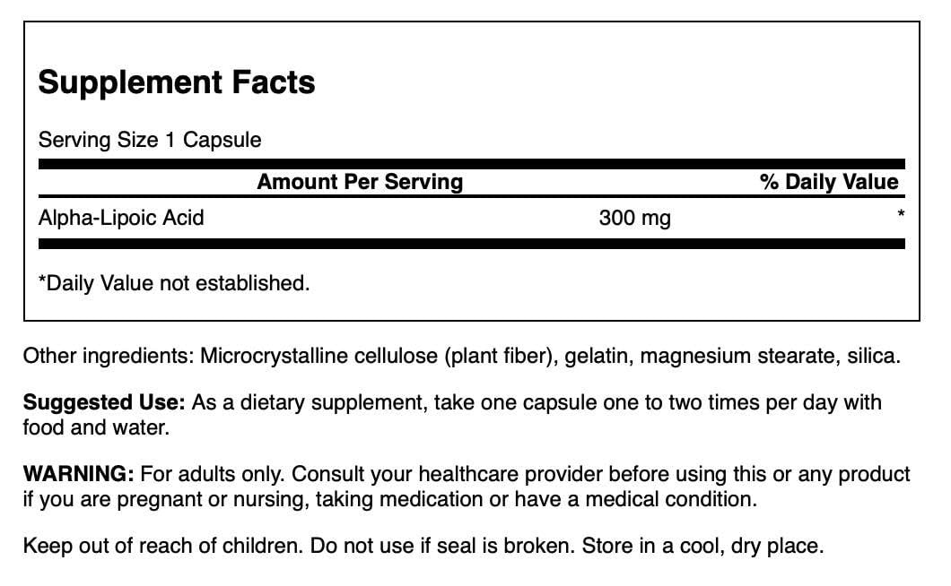 | ingredients | Alpha-Lipoic Acid 300 mg *,Other ingredients: Gelatin, calcium laurate, microcrystalline cellulose (plant fiber), silica.,As a dietary supplement, take one capsule one to two times per day with water. |