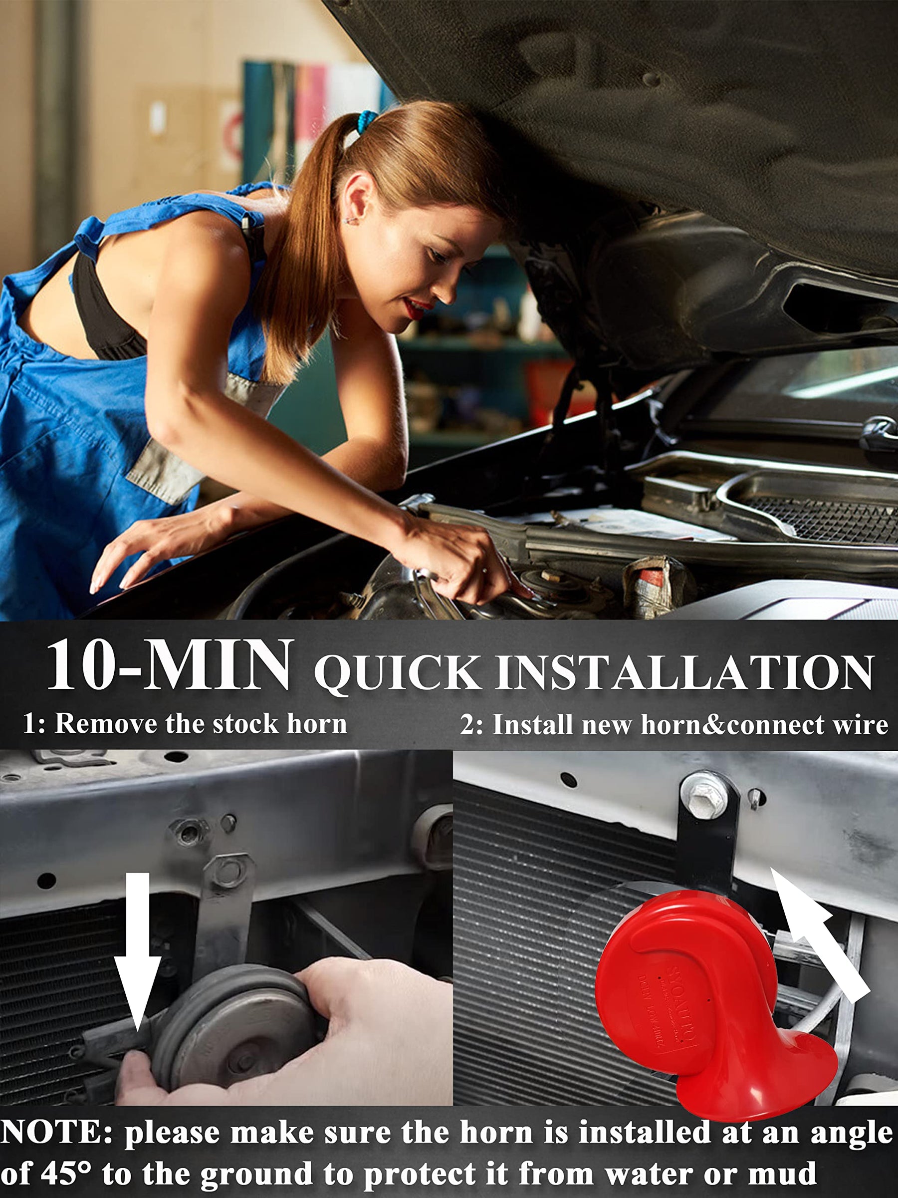 - 10-min quick installation: The 12v horn kit is no polarity. Please make sure the horn mouth down not up to protect it from mud and the car have enough room to install the snail horn. Universal fit for all 12V vehicles(car, truck, SUV, motorcycle, yacht, boat, off-road vehicle, bus, etc)