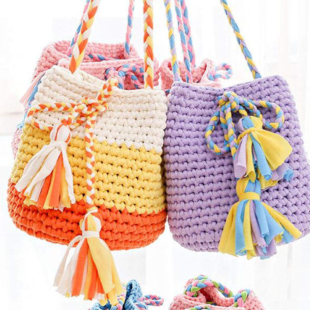 - There are lots of great craft ideas to make with Tshirt yarn supply. You can knit/crochet some home decor trends (such as carpet, rug, pouf, basket, macrame, plant hanger, wall hanging), some women jewelry accessories (such as necklace, bracelet), some women accessories (such as headband, slippers, infinity scarf, backpack, handbag), some Kids’ Craft projects and some craft supplies (such as tassel, pom pom)