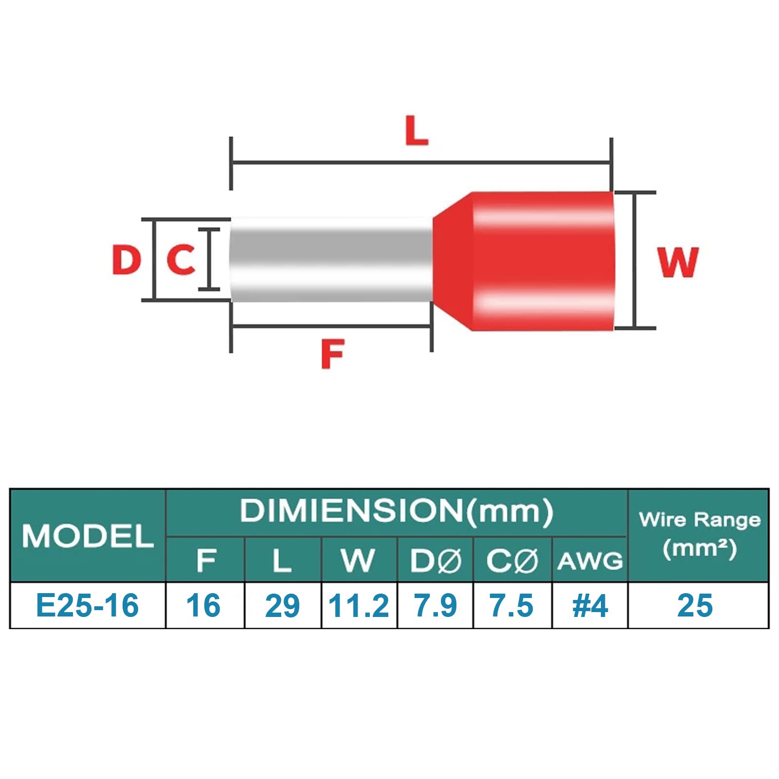 - Ferrule Wire Range - Cord Pin End Terminals , 25mm² / 4 AWG.