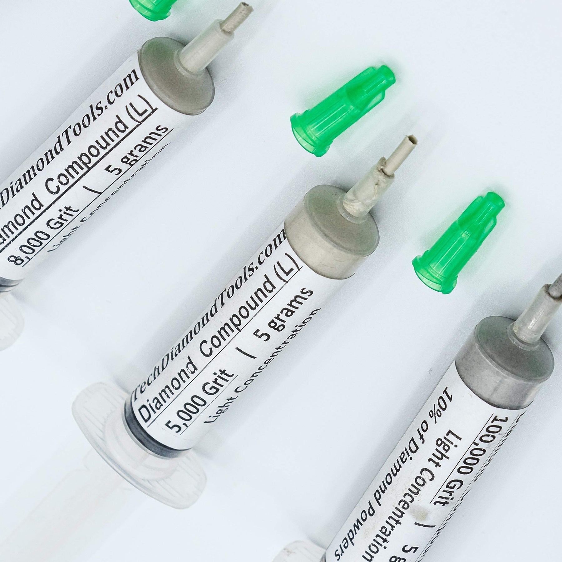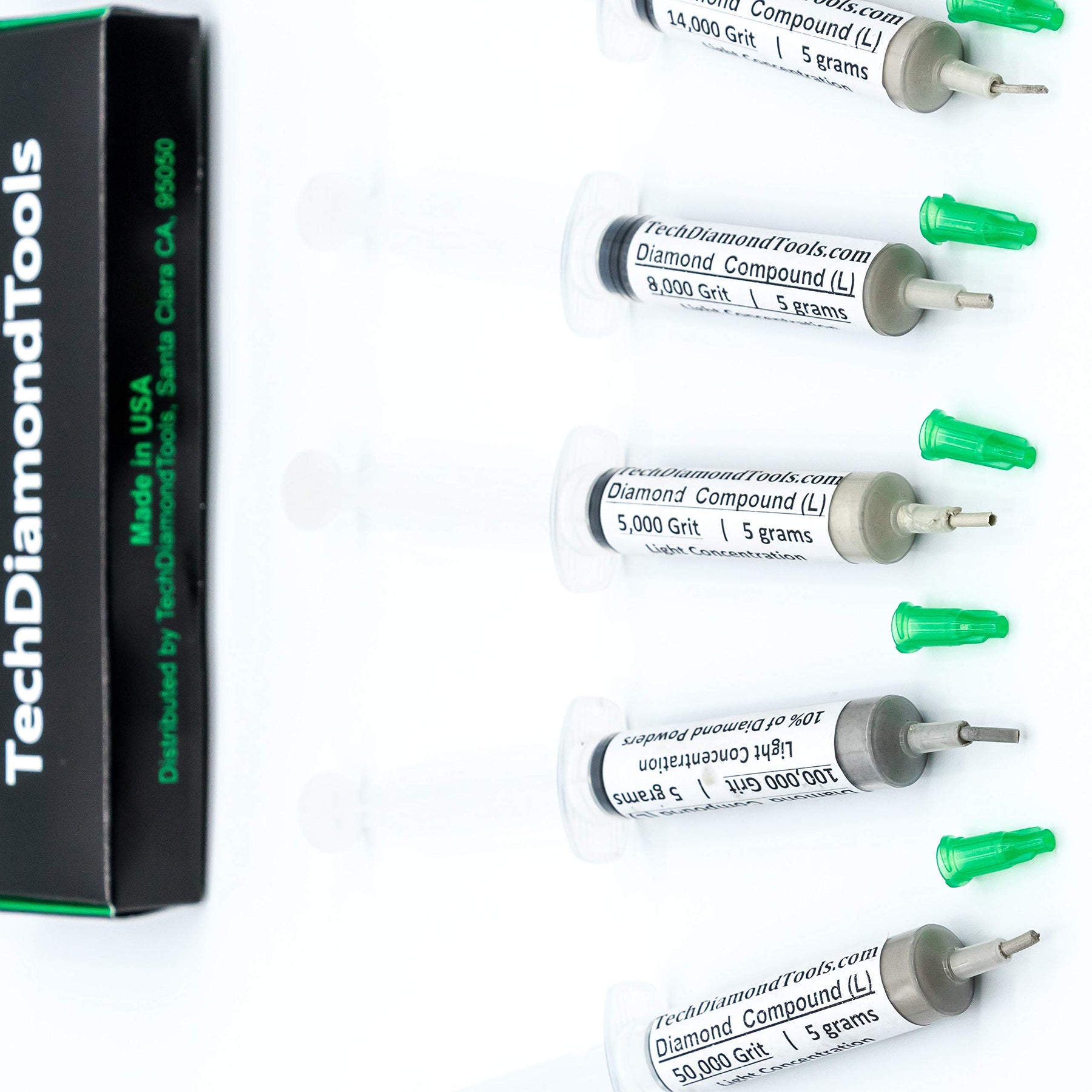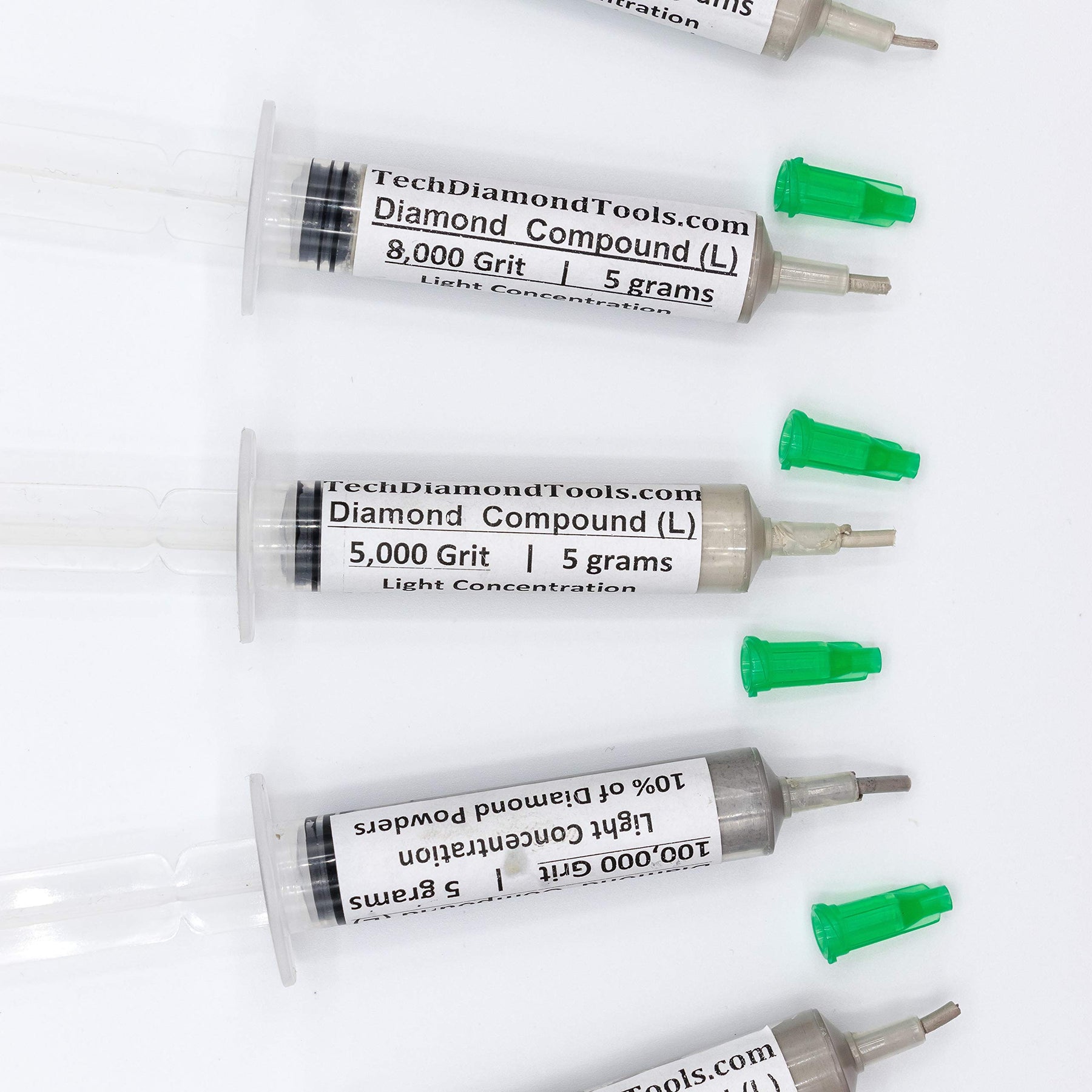 - OIL-BASED COMPOUND: we offer a set of 5 items 5 gram syringes of industrial quality diamond polishing paste with 10% concentration of diamond powder, professional grade of 5,000 Grit 1.5 to 3 Microns and 8,000 Grit 0 to 2 Microns for Mirror Finish, 14,000 Grit 0 to 1 Microns, 50,000 Grit 0 to 0,5 Microns and 100,000 Grit 0 to 0,25 Microns for Final Polish.