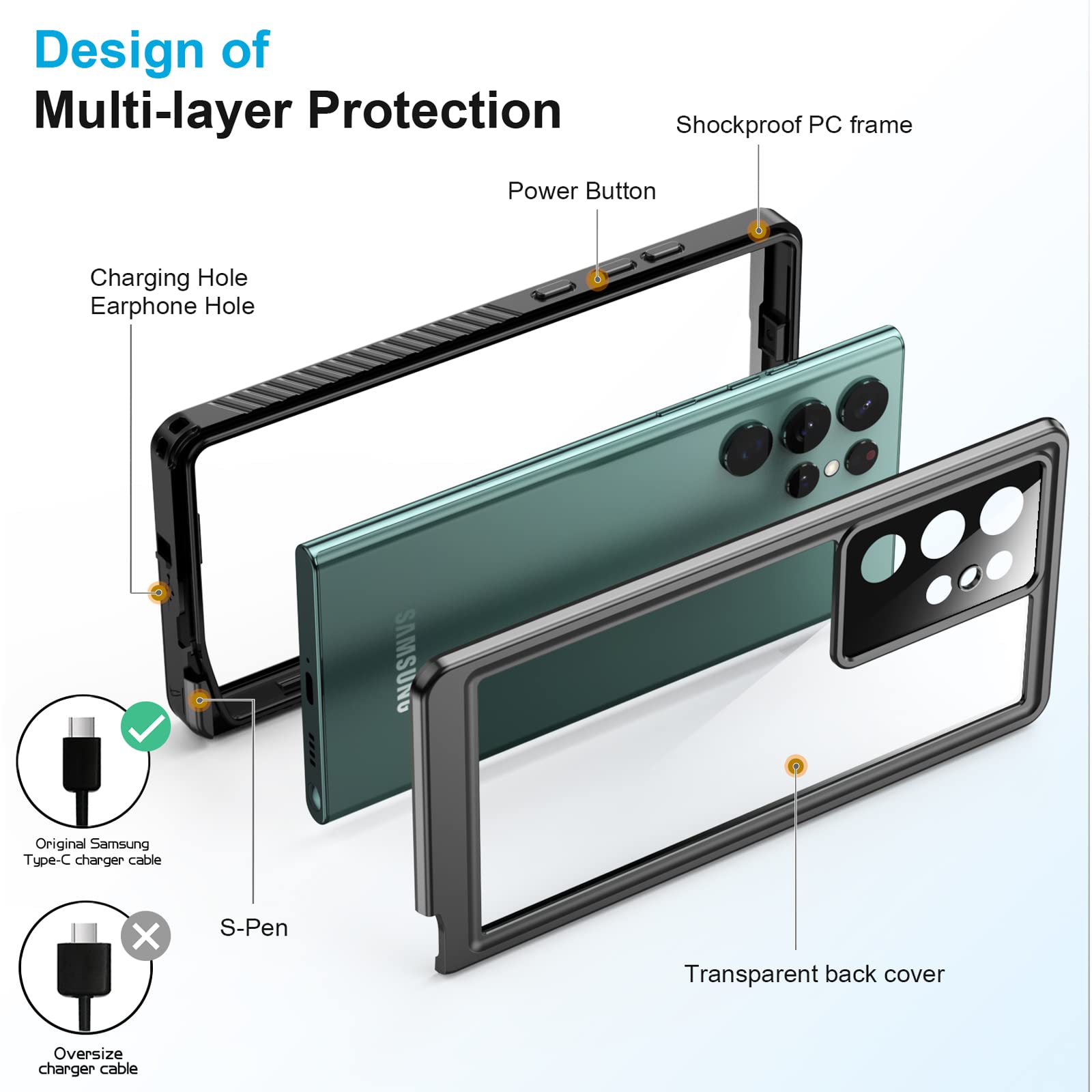 - ?IP68 Waterproof?IP68 Certified Waterproof S22 ultra case, Protecting your S22 ultra perfectly in any bad environment. Perfect for any underwater activities, outdoor sports and daily use.Opening the charging port will made you hear and heard more clearly.