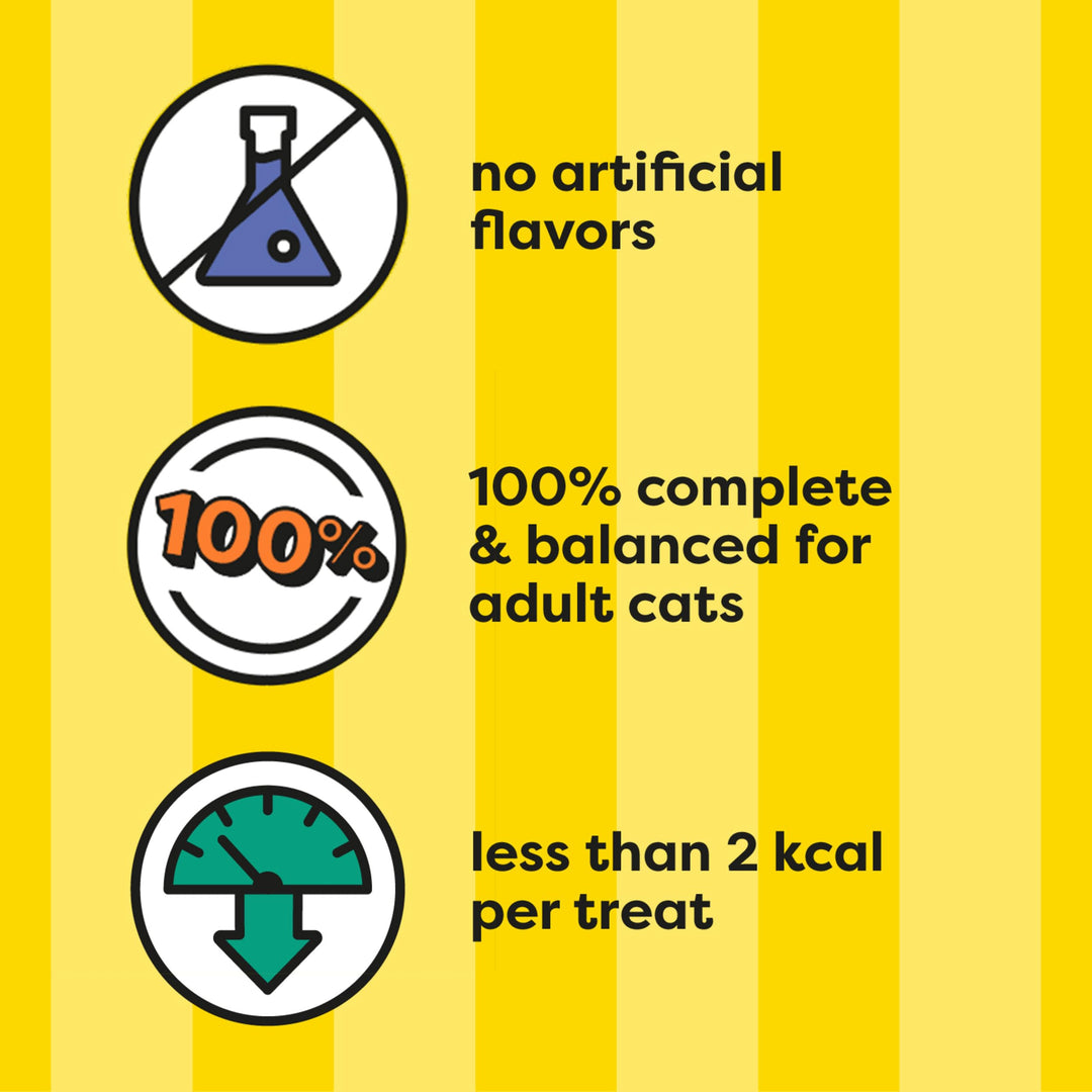 - 100% Complete and Balanced For Adult Cats: Feel great about treating your phenomenal feline with a cat treat that’s 100% nutritionally complete and balanced for adult cat maintenance.