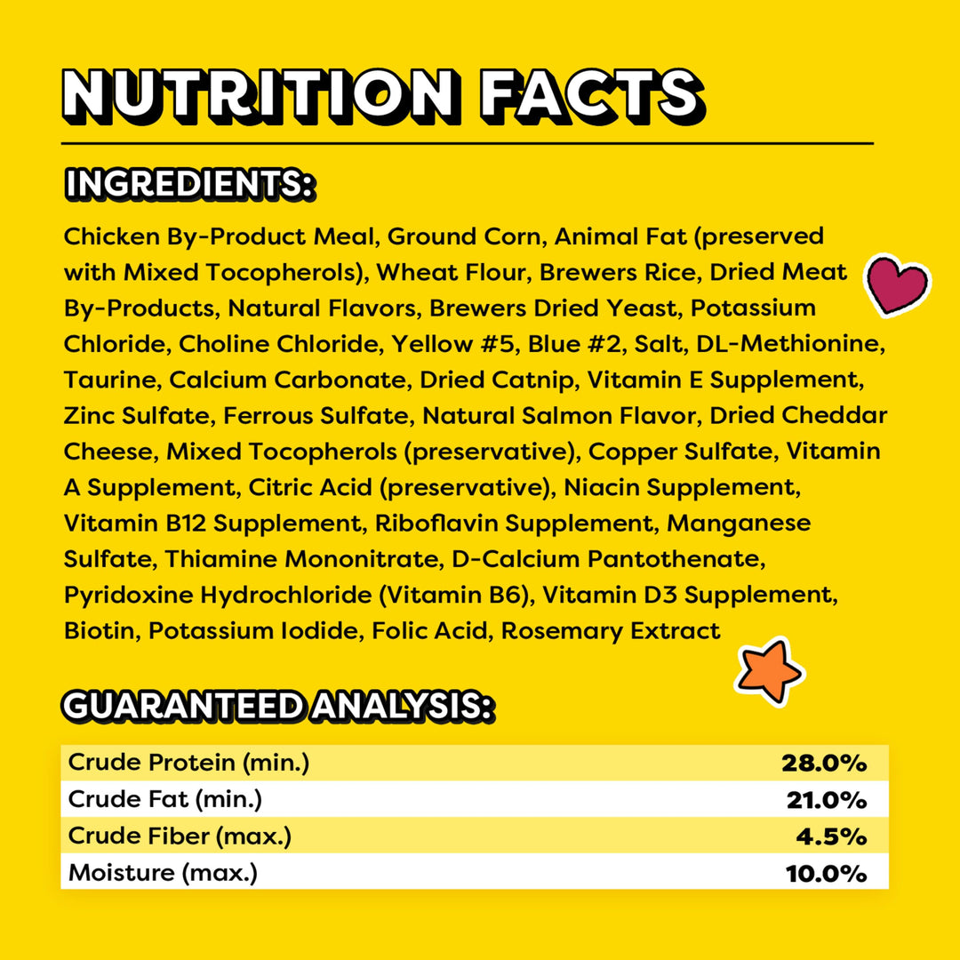 | ingredients | Chicken By-Product Meal, Ground Corn, Animal Fat (preserved with Mixed Tocopherols), Wheat Flour, Brewers Rice, Dried Meat By-Products, Natural Flavors, Brewers Dried Yeast, Potassium Chloride, Choline Chloride, Yellow #5, Blue #2, Salt, DL-Methionine, Taurine, Calcium Carbonate, Dried Catnip, Vitamin E Supplement, Zinc Sulfate, Ferrous Sulfate, Natural Salmon Flavor, Dried Cheese, Mixed Tocopherols (preservative), Copper Sulfate, Vitamin A Supplement, Citric Acid (preservative), Niacin Supplement, Vitamin B12 Supplement, Riboflavin Supplement, Manganese Sulfate, Thiamine Mononitrate, D-Calcium Pantothenate, Pyridoxine Hydrochloride (Vitamin B6), Vitamin D3 Supplement, Biotin, Potassium Iodide, Folic Acid, Rosemary Extract |