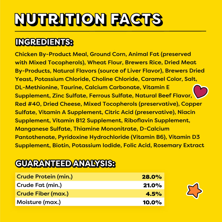 | ingredients | Chicken By-Product Meal, Ground Corn, Animal Fat (preserved with Mixed Tocopherols), Wheat Flour, Brewers Rice, Dried Meat By-Products, Natural Flavors (source of Liver Flavor), Brewers Dried Yeast, Potassium Chloride, Choline Chloride, Caramel Color, Salt, DL-Methionine, Taurine, Calcium Carbonate, Vitamin E Supplement, Zinc Sulfate, Ferrous Sulfate, Natural Beef Flavor, Red #40, Dried Cheese, Mixed Tocopherols (preservative), Copper Sulfate, Vitamin A Supplement, Citric Acid (preservative), Niacin Supplement, Vitamin B12 Supplement, Riboflavin Supplement, Manganese Sulfate, Thiamine Mononitrate, D-Calcium Pantothenate, Pyridoxine Hydrochloride (Vitamin B6), Vitamin D3 Supplement, Biotin, Potassium Iodide, Folic Acid, Rosemary Extract |