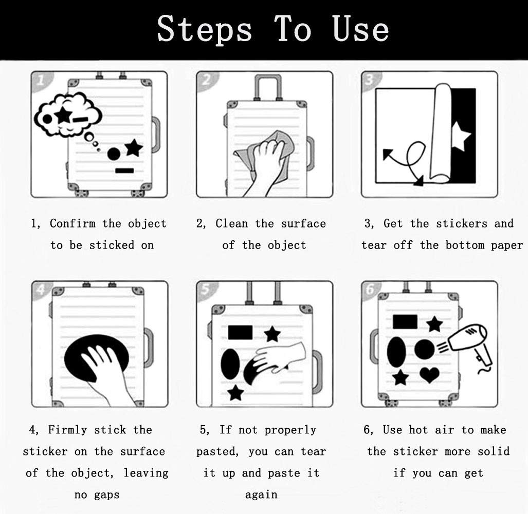 - Steps To Use--Get your stickers, clean the surface of the object, tear off the bottom paper of the stickers, and firmly stick the sticker on the surface of the object, leaving no gaps. Just feel free to customize your belongings, make your personality shine! PLEASE ATTENTION: These Stickers Are Not Applicable to Rough And Uneven Surfaces.