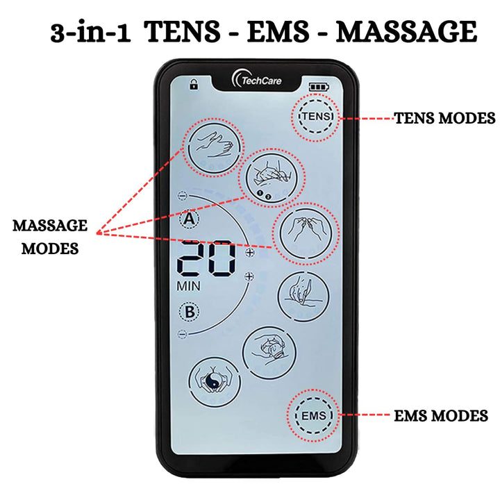 - WHAT IS TECHCARE MASSAGER : It is a combination of TENS and PMS device, drug free method of pain relief used by Physical Therapists and prescribed Doctors for over 40 years. TechCare Massagers delivers low-voltage pulses to the skin to stimulate nerve fibers effectively blocking the pain signal to your brain. Also increases natural endorphins--a natural pain reliever. There will be NO need for pain pills ANYMORE!