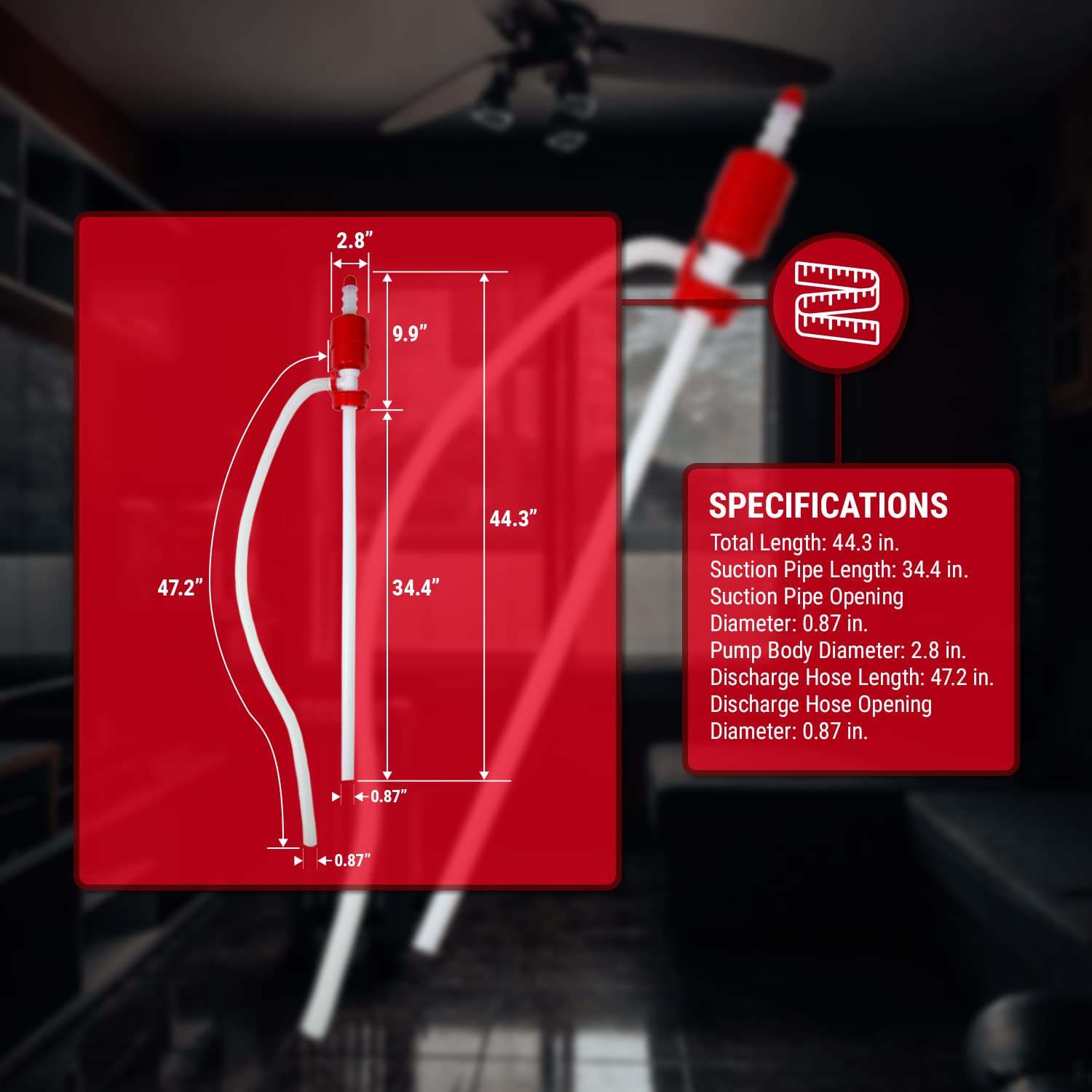 - [ SPECS ] Total Length: 45.7-inch , Suction Tube Length of 33.6-inch with 0.87-inch opening , Corrugated & Flexible Discharge Tube Length: 46.4-inch with 0.87-inch Opening - Ideal for any Emergency or Disaster Ready Kit