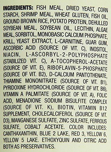 | ingredients | FISH MEAL, DRIED YEAST, WHEAT GLUTEN, CORNSTARCH, SHRIMP MEAL, DEHULLED SOYBEAN MEAL, DRIED FISH PROTEIN DIGEST, GROUND BROWN RICE, FISH OIL, POTATO PROTEIN, SOYBEAN OIL, LECITHIN, ALGAE MEAL, INULIN, SORBITOL, VITAMINS (ASCORBIC ACID, INOSITOL NIACIN, A-TOCOPHEROL-ACETATE, RIBOFLAVIN-5- PHOSPHATE, D-CALCIUM PANTOTHENATE, THIAMINE MONONITRATE, VITAMIN A PALMITATE, PYRIDOXINE HYDROCHLORIDE, VITAMIN B12 SUPPLEMENT CHOLECALCIFEROL), MONOCALCIUM PHOSPHATE, FD&C YELLOW #5 LAKE, FRESHWATER SHRIMP, YEAST EXTRACT, L-ASCORBYL-2-POLYPHOSPHATE (STABILIZED VITAMIN C), KRILL MEAL, FD&C RED #3, FD&C BLUE #2 LAKE, MINERALS (MANGANESE SULFATE, ZINC SULFATE, FERROUS SULFATE), CITRIC ACID (PRESERVATIVE), CANTHAXANTHIN, FD&C YELLOW #6 LAKE, L-CARNITINE, BIOTIN, ROSEMARY EXTRACT, MIXED TOCOPHEROLS (PRESERVATIVE), PROPYL GALLATE (PRESERVATIVE), MENADIONE SODIUM BISULFITE COMPLEX (SOURCE OF VITAMIN K ACTIVITY), FOLIC ACID, GUAR GUM |