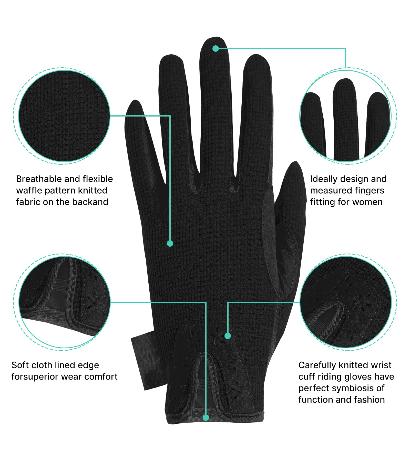 - CONVENIENT RIDIING GLOVES --- Carefully knitted wrist cuff with elastic band stitched inside, easy to put on and take off. Provide maximum freedom of movement when riding.