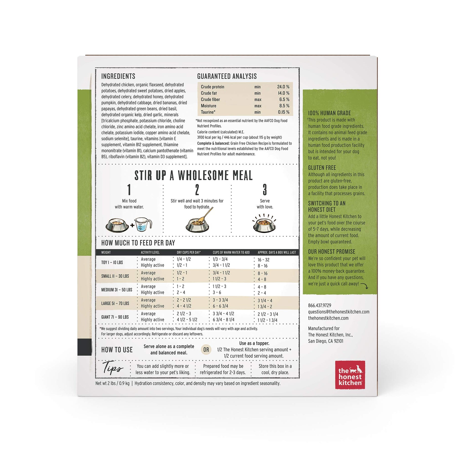 - GRAIN FREE, FREE RANGE CHICKEN: The Honest Kitchen Grain Free Chicken dog food is made with real whole food ingredients like free range chicken, green beans & apples, which are gently dehydrated for maximum nutrient retention and easy digestion.